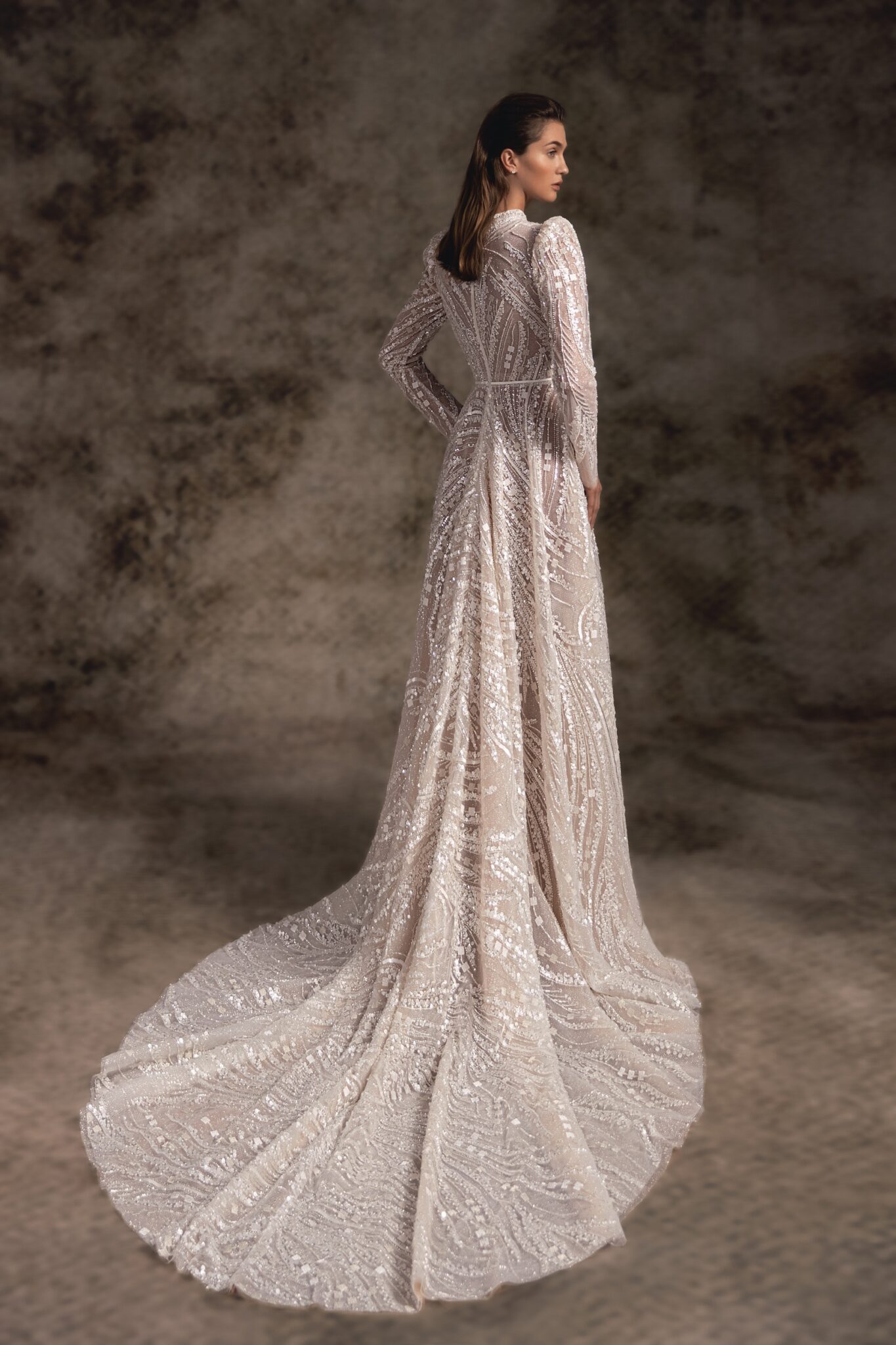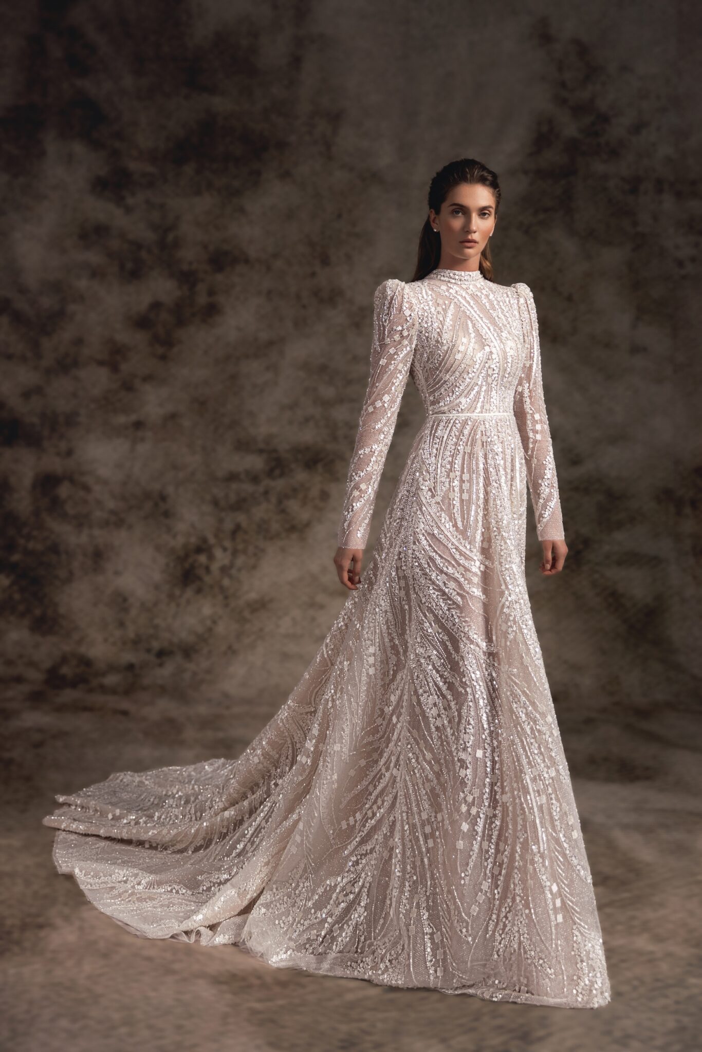 Notte d'OperaDecorated with the spectacular hand-embroidered lace of geometric pattern, Bristol is a true queen-inspired A-line wedding gown. A tailored strong-shouldered corset with long sleeves and high neck proceeds to the delicate thin waistbelt that accentuates the bride’s figure. An elegant skirt features a dramatic, pointed cathedral-length train adorned in delicate beaded lace. For a more opulent look a dress can be accomplished with a detachable overskirt made of cascading rows of Tulle ruffles.