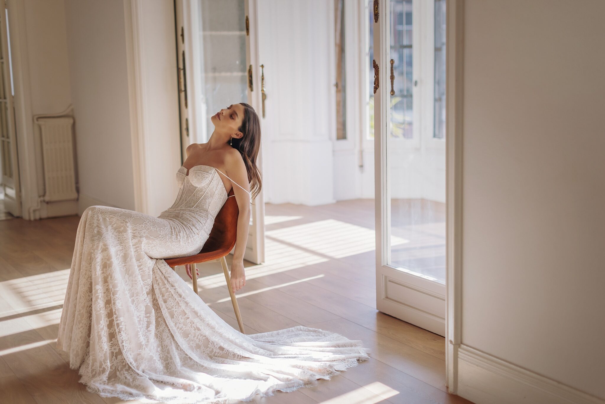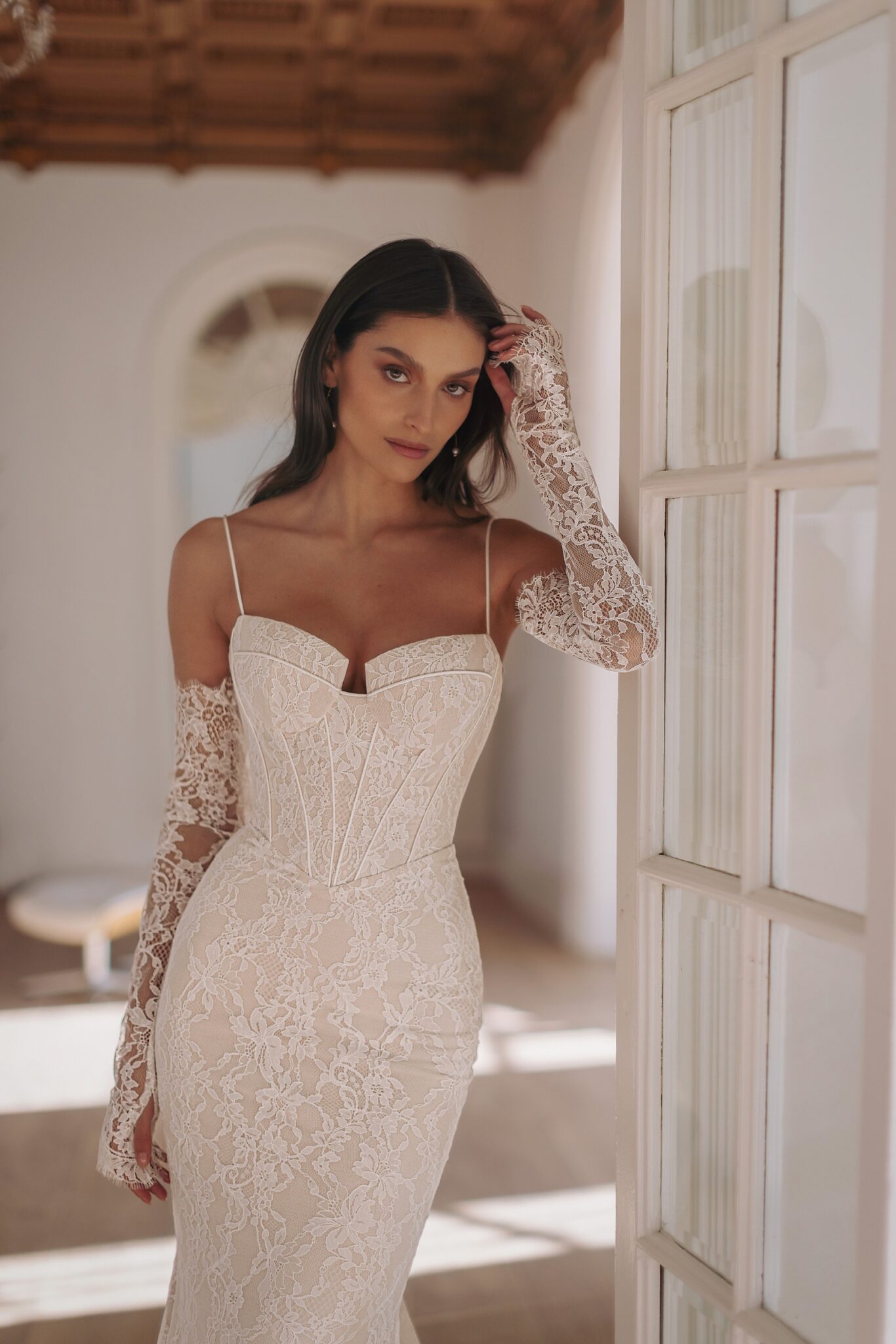 GeminiBronx — lace embellished mermaid silhouette with corset and thin straps, complemented by detachable lace long gloves.