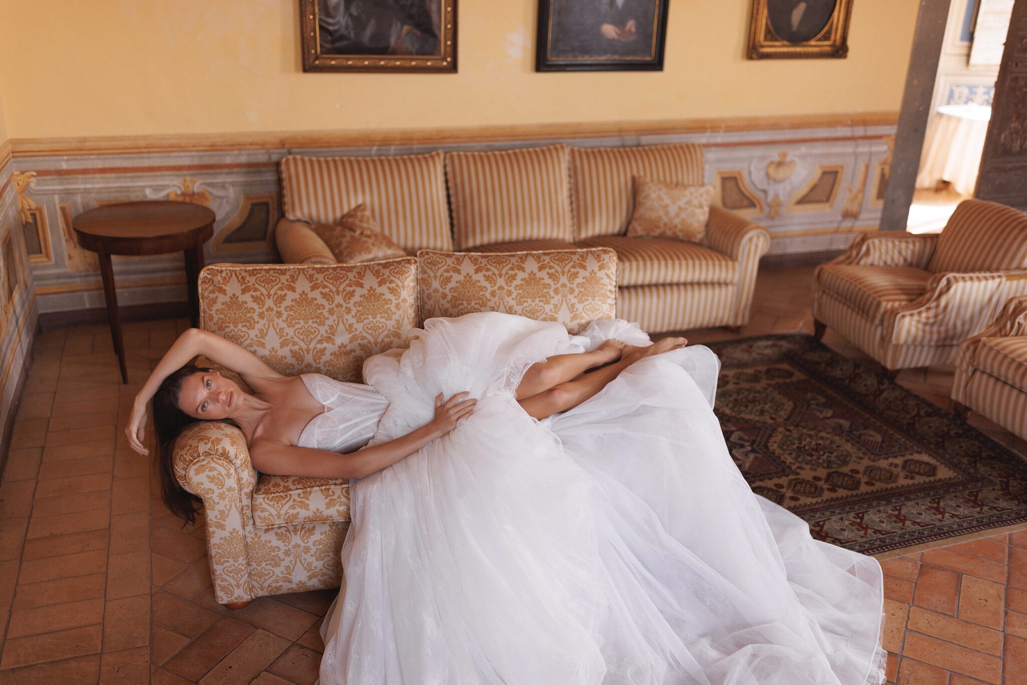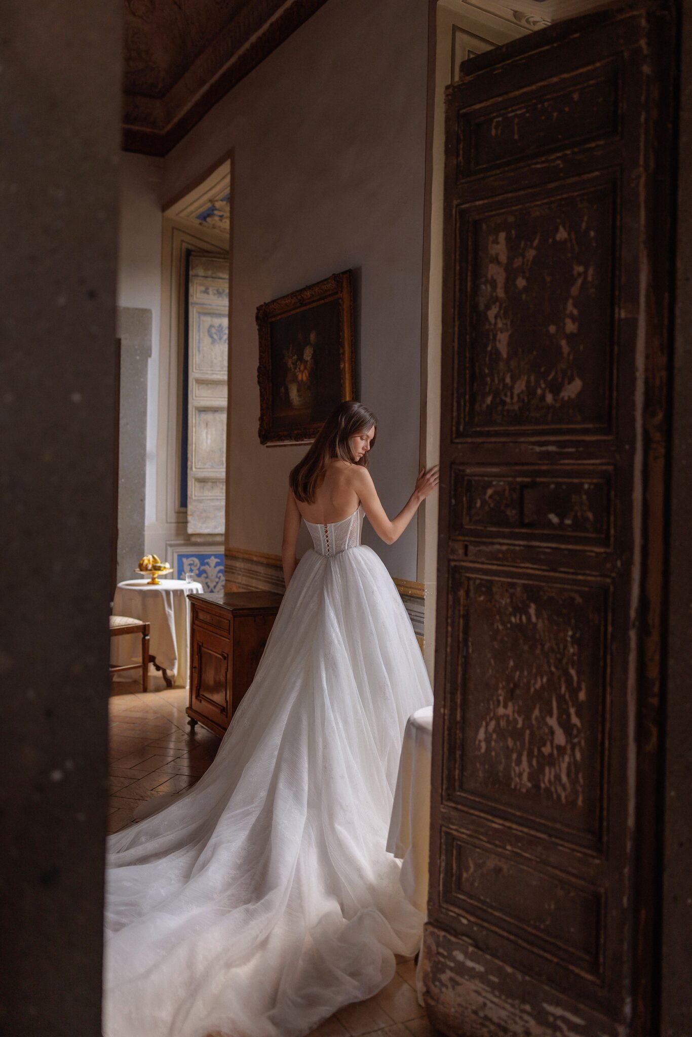 L'Unico, Plus SizeCinderella gown: heart-shaped neckline detailed corset and voluminous skirt made of semi-matte fabric.
