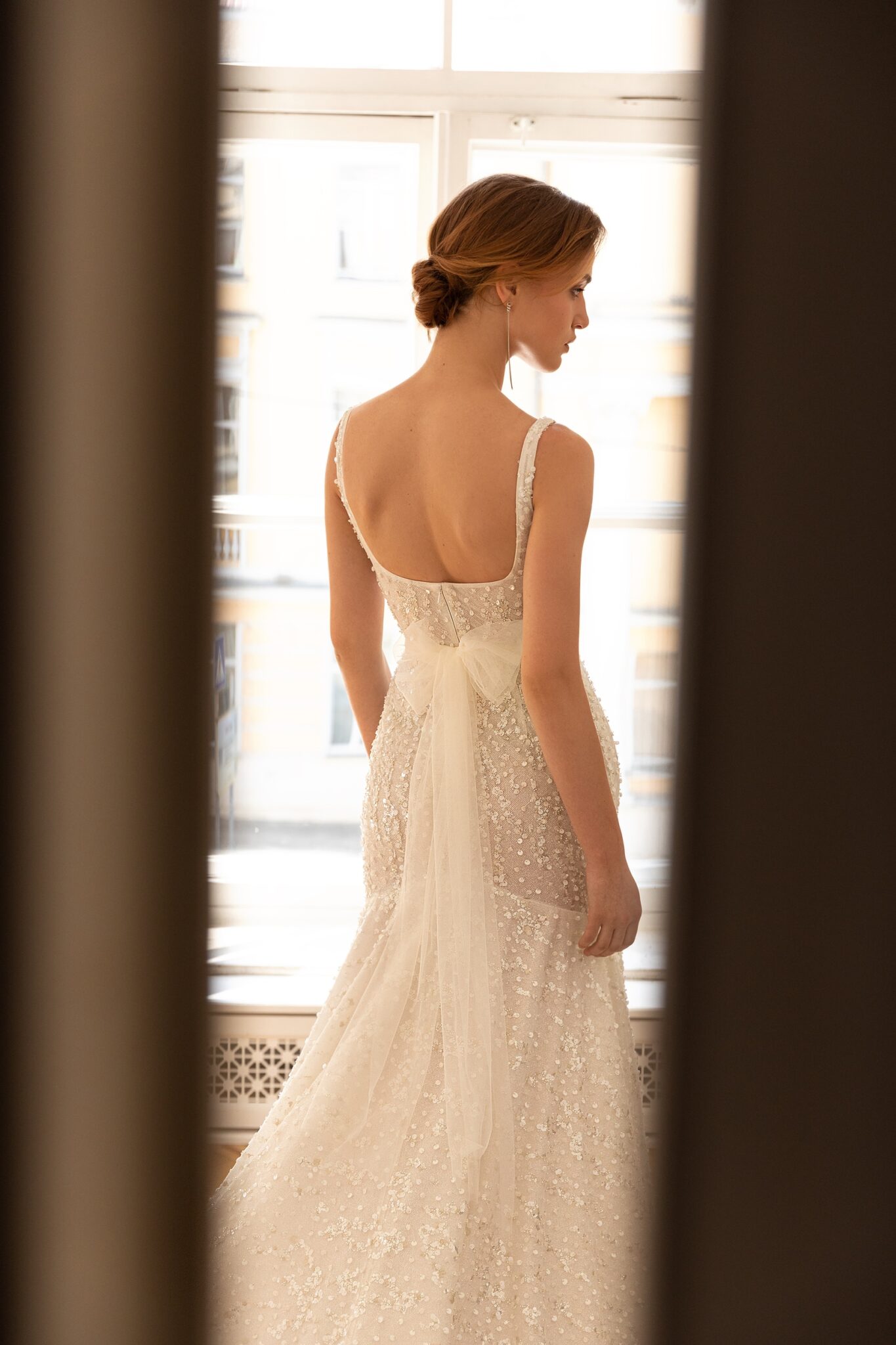 Less is more 2022Calabria is a tender and feminine wedding dress decorated with sparkling sequins through all length. The wedding gown with a Boat neckline has wide straps and accentuates the bride’s waistline with a transparent Tulle band tied in a bow on the back. The skirt is fitted on the hips and widens down to the floor creating a beautiful mermaid silhouette with a long train.