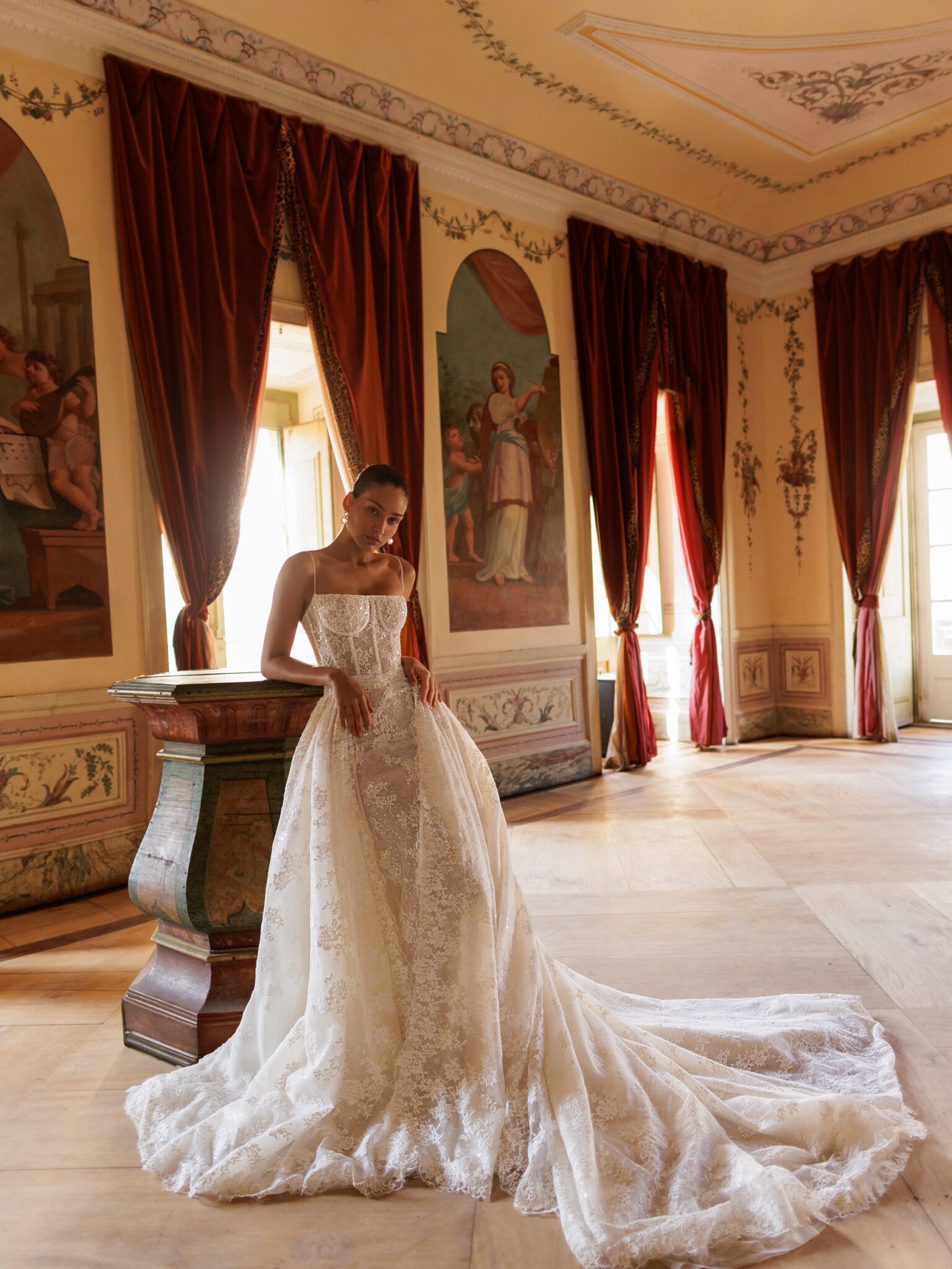 Bridal AlchemyA striking mermaid-style wedding gown with a detachable chapel-length train. Crafted from luxurious lace and adorned with delicate lace appliqués, this gown blends elegance with versatility. The train is fully embellished with lace and effortlessly fastens at the waist, secured with a lace-up back for a seamless fit.