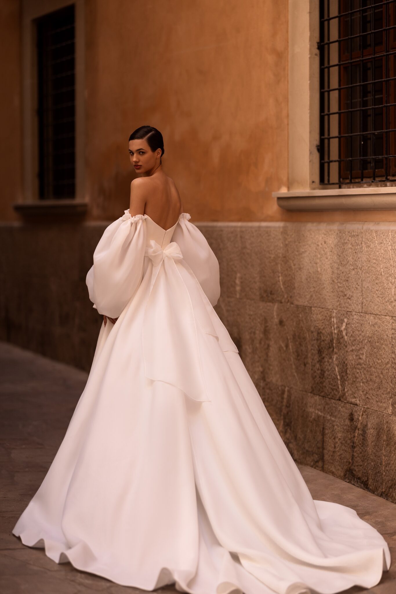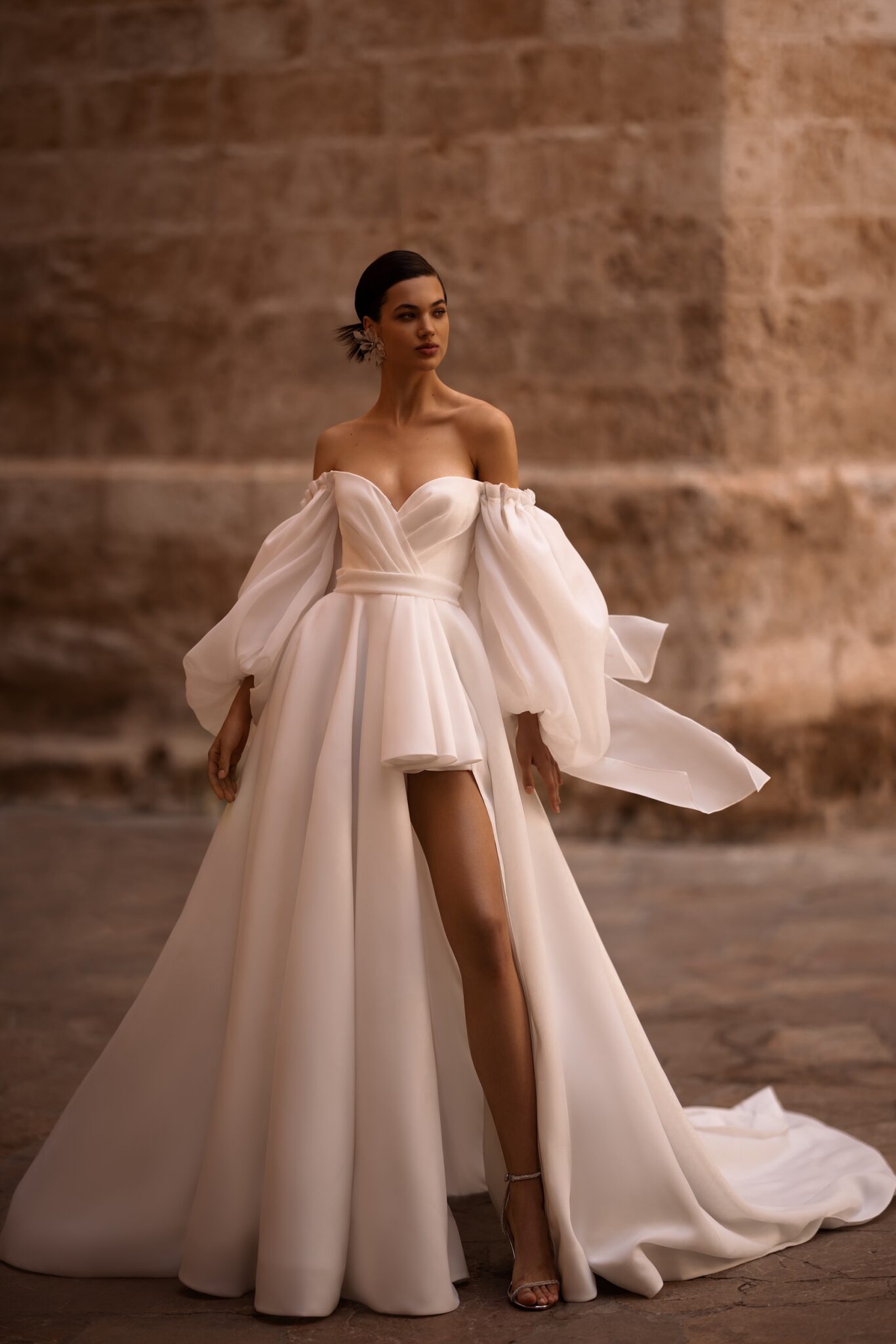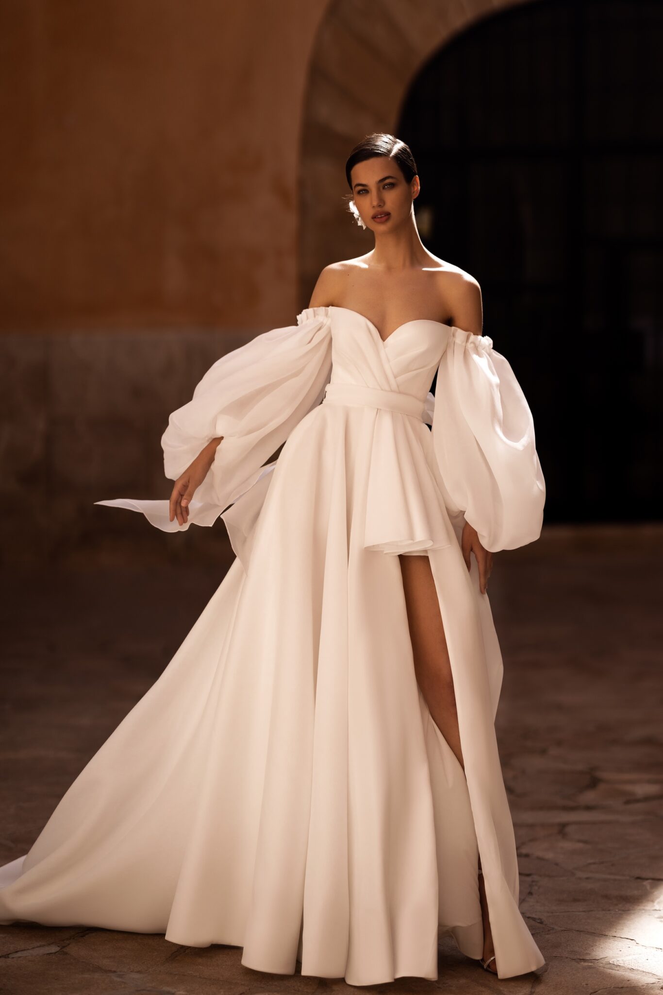 Alma de OroElevate your bridal look with our enchanting A-line wedding dress, a harmonious blend of elegance and modernity. The ethereal tulle fabric gracefully flows, lending an air of romance to your every movement. The draped off-shoulder corset delicately enhances your femininity, while the sweetheart neckline accentuates your natural beauty. The puffy sleeves add a touch of whimsy, framing your arms with grace. As you walk down the aisle, the asymmetric skirt gracefully reveals glimpses of your leg, exuding confidence and allure. To add a final touch of sophistication, a beautiful bow adorns the back, leaving a lasting impression as you take your vows. Experience the perfect fusion of timeless charm and contemporary flair in this A-line wedding dress, designed to make your special day truly unforgettable.