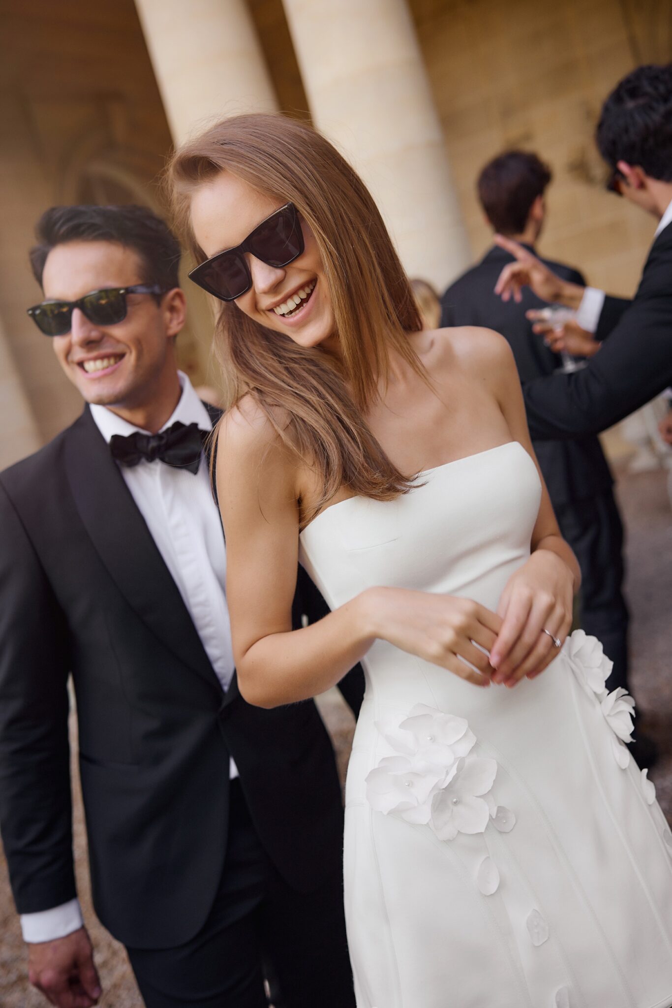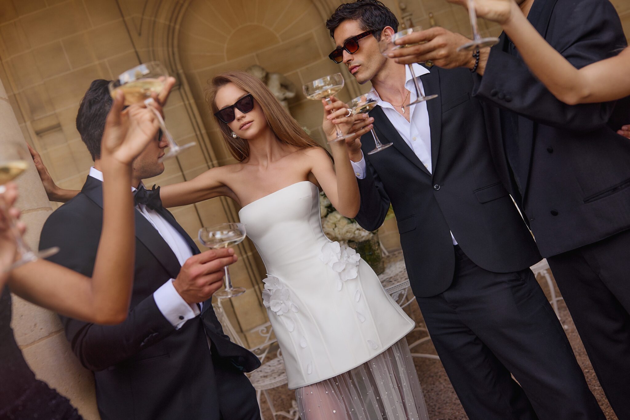 Love StoryStrapless dress with floral handcrafted embroideries on the hips. The shaped mini skirt, complemented with a sophisticated beaded maxi under-skirt made of tulle, adds a touch of playfulness to the attire.