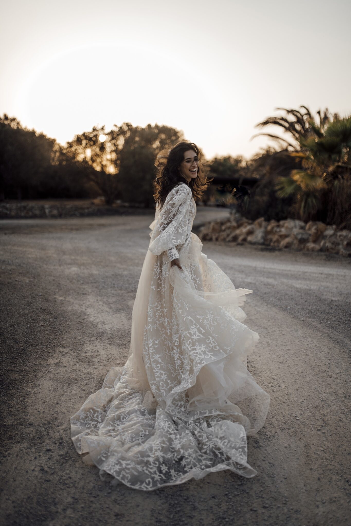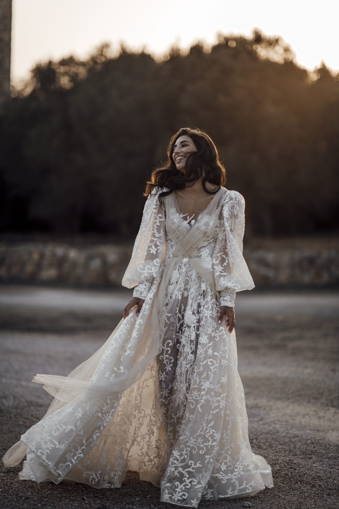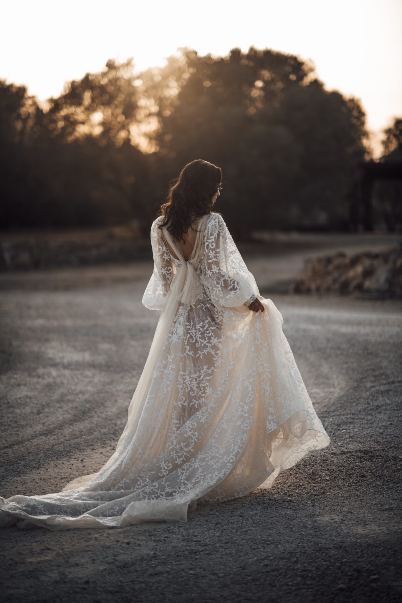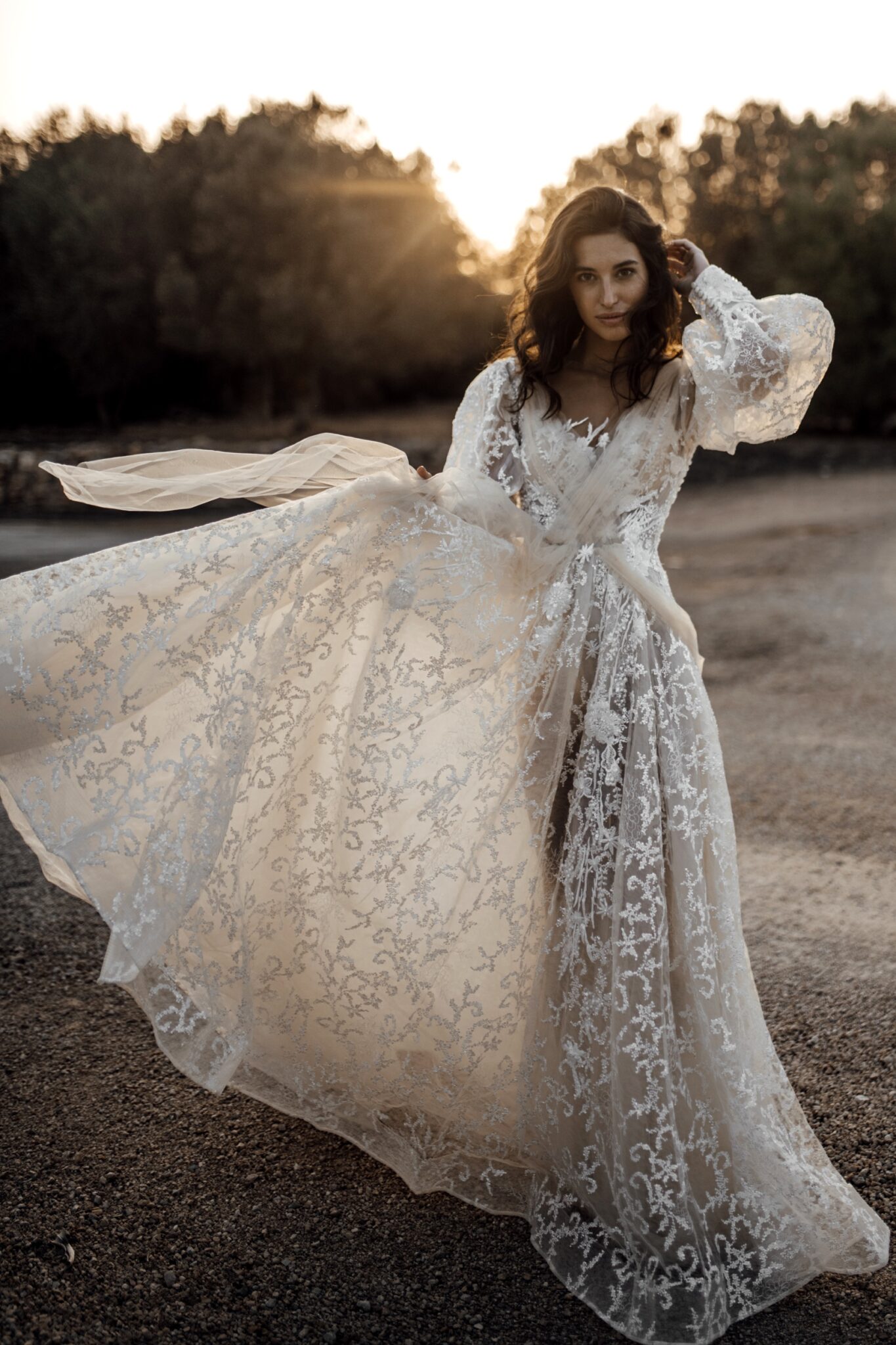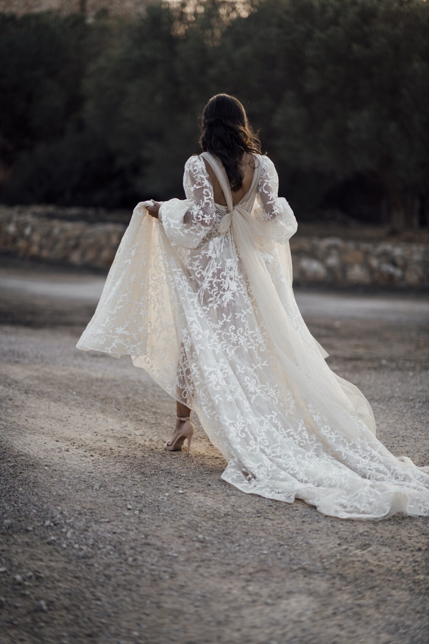 Love storiesSpectacular Candice wedding dress takes your breath away. A combination of different materials creates the airy and loose look. A bridal gown is made of sheer fabric with a floral pattern. Long, airy sleeves look fantastic. Veiling insets at the front and back of the dress are tied in a bow.