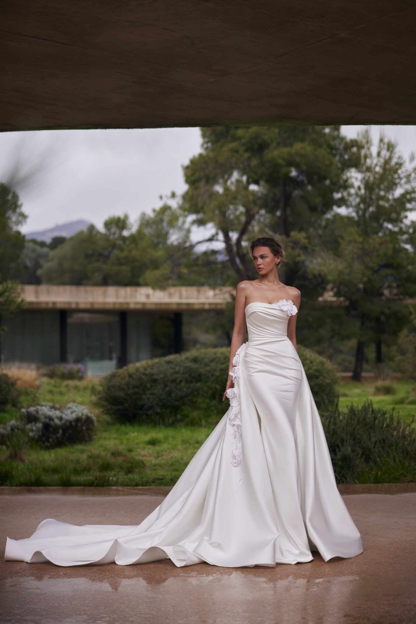The gown features a long, flowing train, which attaches securely at the waist using discreet lacing. This fastening system is both reliable and nearly invisible, ensuring a seamless look from every angle.