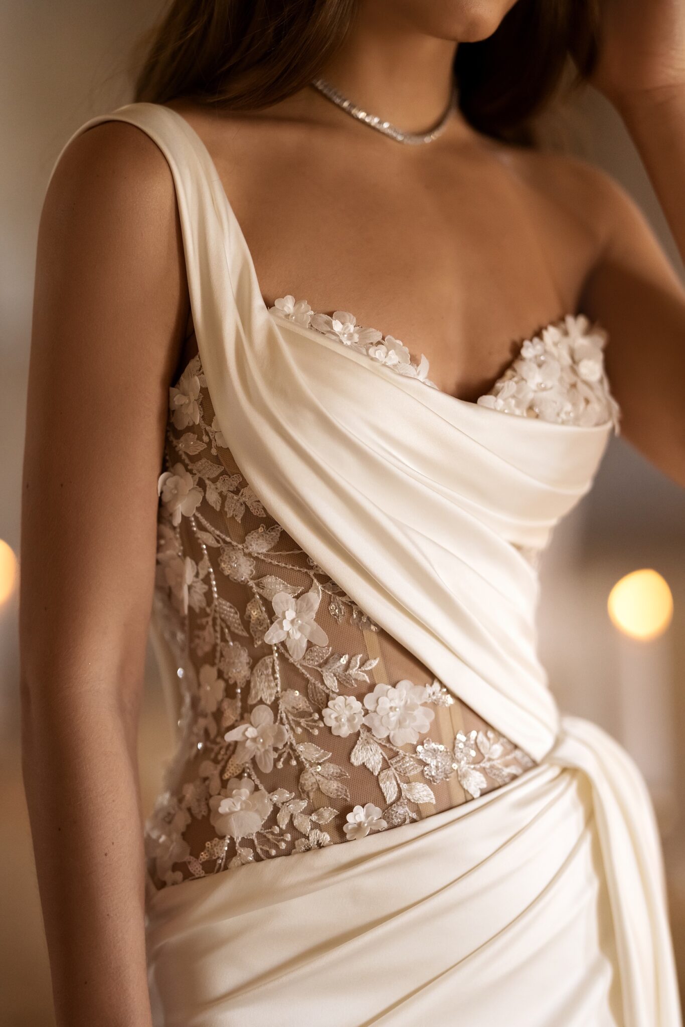 Love Spell, Plus Size, Sample SaleExperience the epitome of elegance with this alluring sheath wedding dress. The transparent corset, adorned with exquisite floral appliques, creates a captivating and romantic effect. With its one asymmetrical strap and decorative elements crafted from glossy fabric, this dress exudes sophistication and charm. The wrap skirt gracefully cascades, adding a touch of whimsy and movement to your every step. To showcase your confidence and style, a high slit on the leg adds a hint of allure. Be prepared to make a statement and leave a lasting impression as you walk down the aisle in this captivating wedding gown.