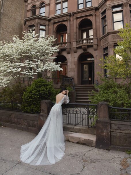 Love in the CityChance is a real fairy gown for a romantic bride. The corset is embroidered with silver sequins and 3D lace and has V-neckline. The decorations proceed to the sleeves, that end with long straps of Tulle. The skirt is made of several layers of weightless Tulle with lace inserts and has long train.