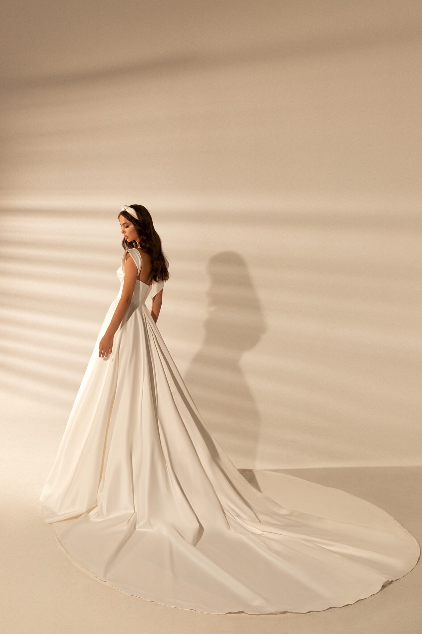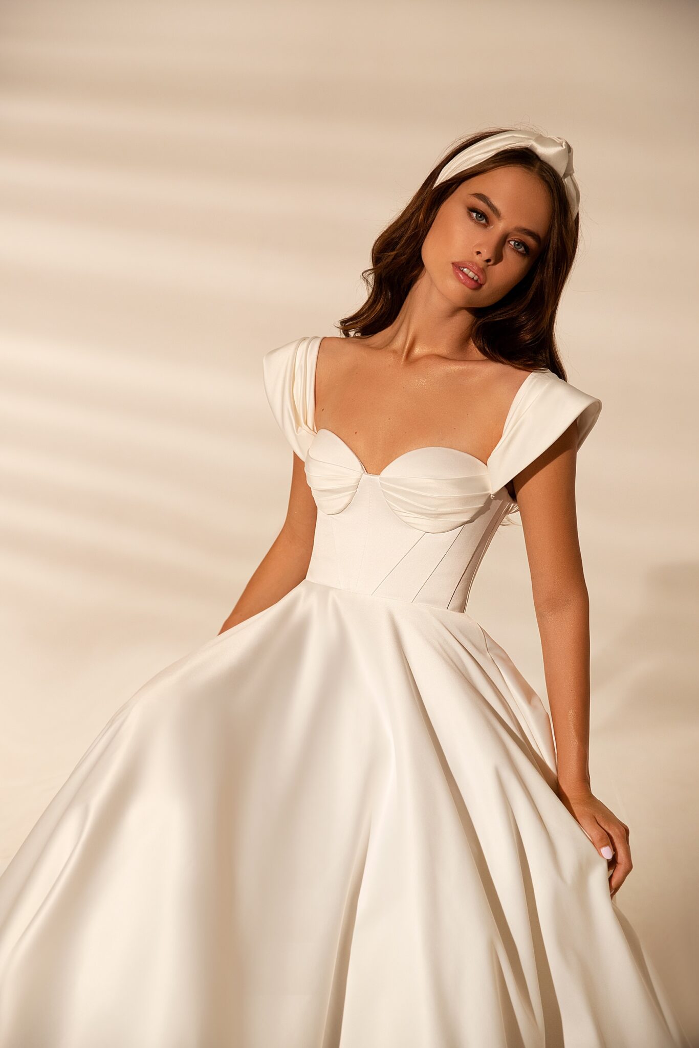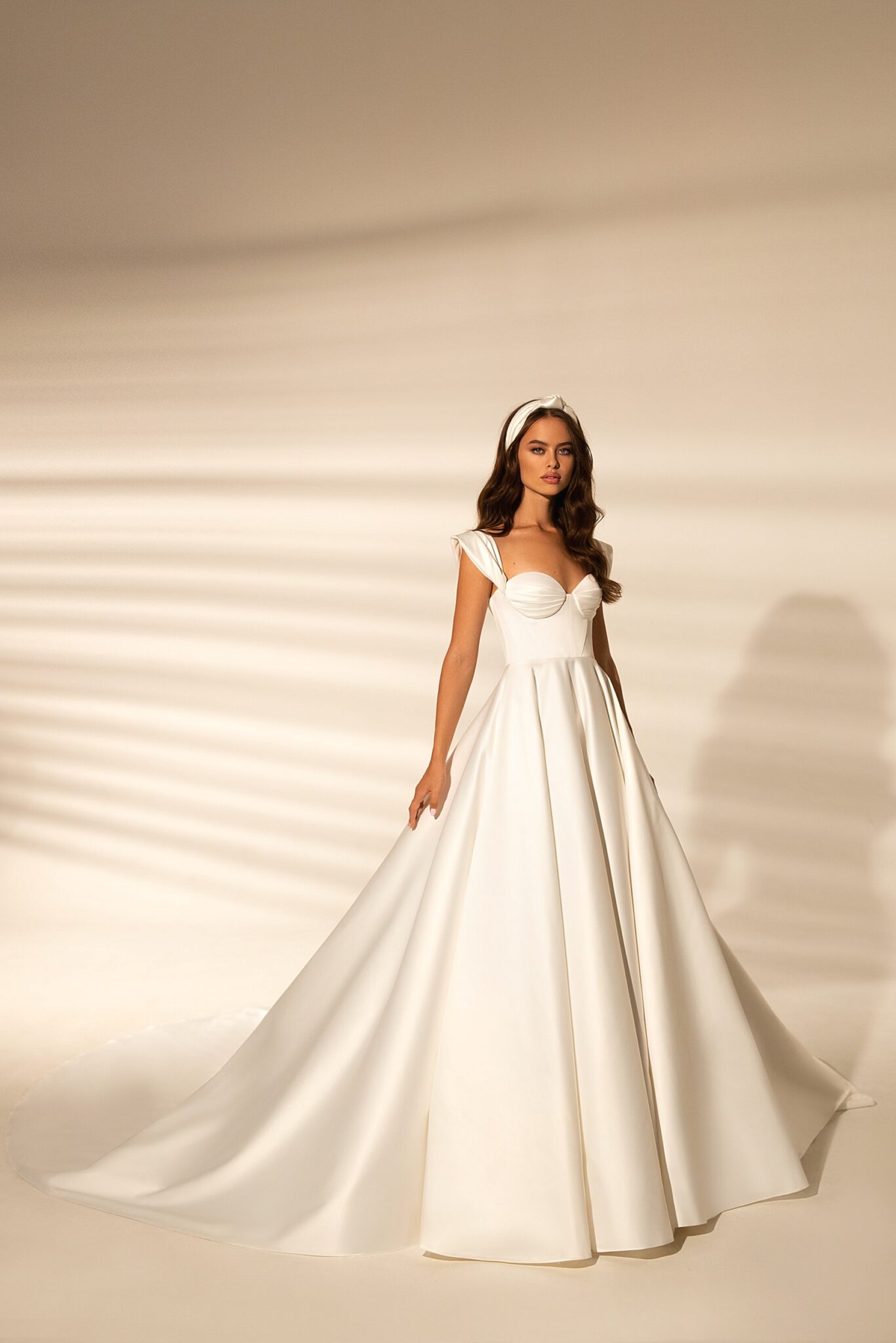 MuseChiara is a fetching wedding dress with a loose skirt and a long train. The wedding gown with a sweetheart neckline is embellished with extraordinary shoulders straps.