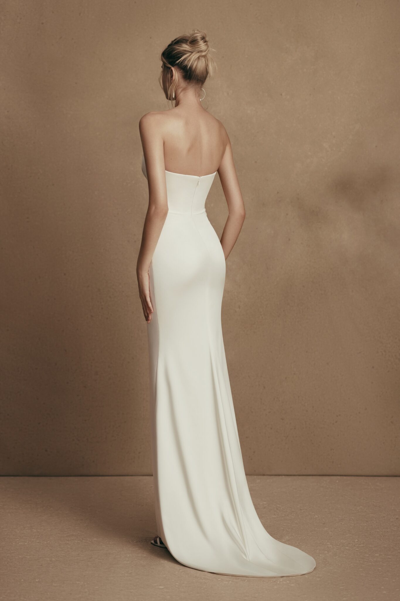 PersonalityClary is a minimalist but elegant satin wedding dress with asymmetric sweetheart strapless corset. The skirt is of sheath silhouette with small chapel train finished off with a seductive slit.