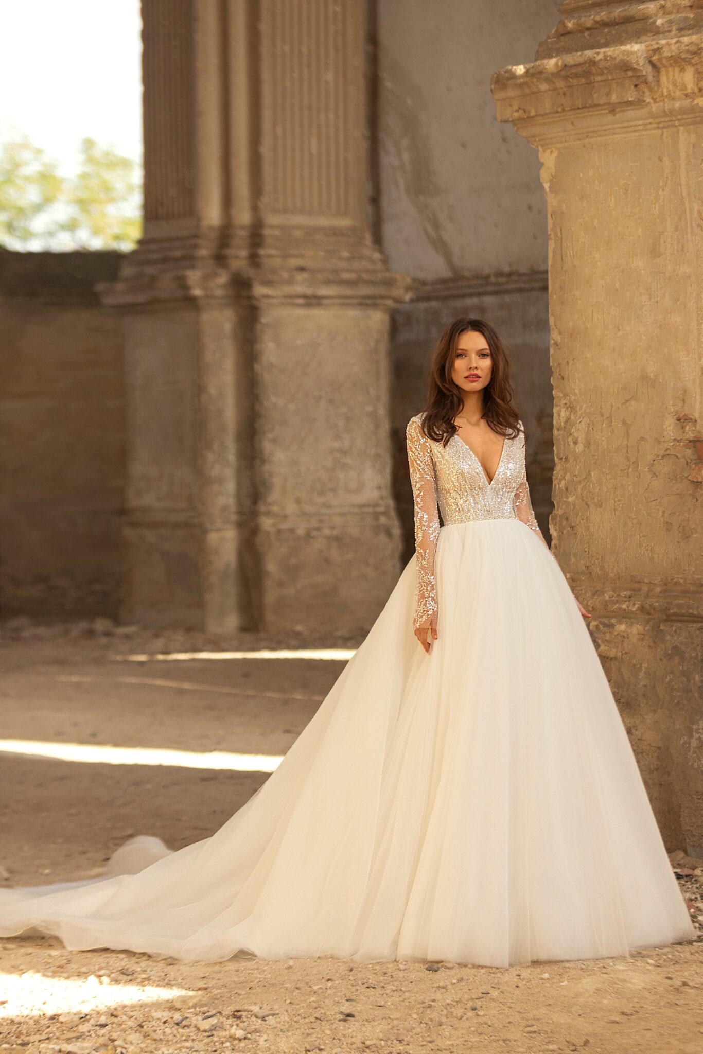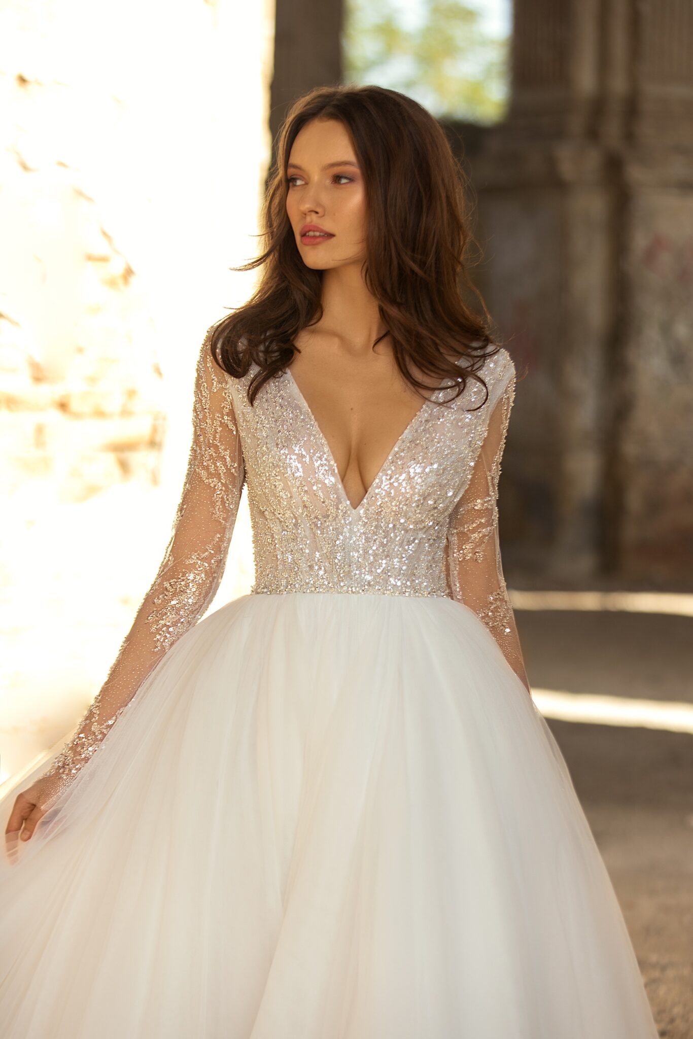 Golden HourCler is a classic A-line wedding gown with a V-shaped neckline and long sleeves. The corset of the dress is decorated with a sparkly lace and perfectly matching simple tule skirt.