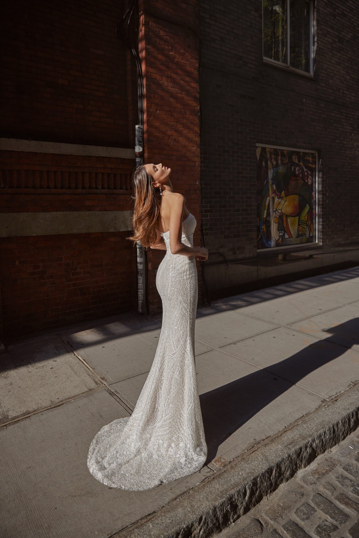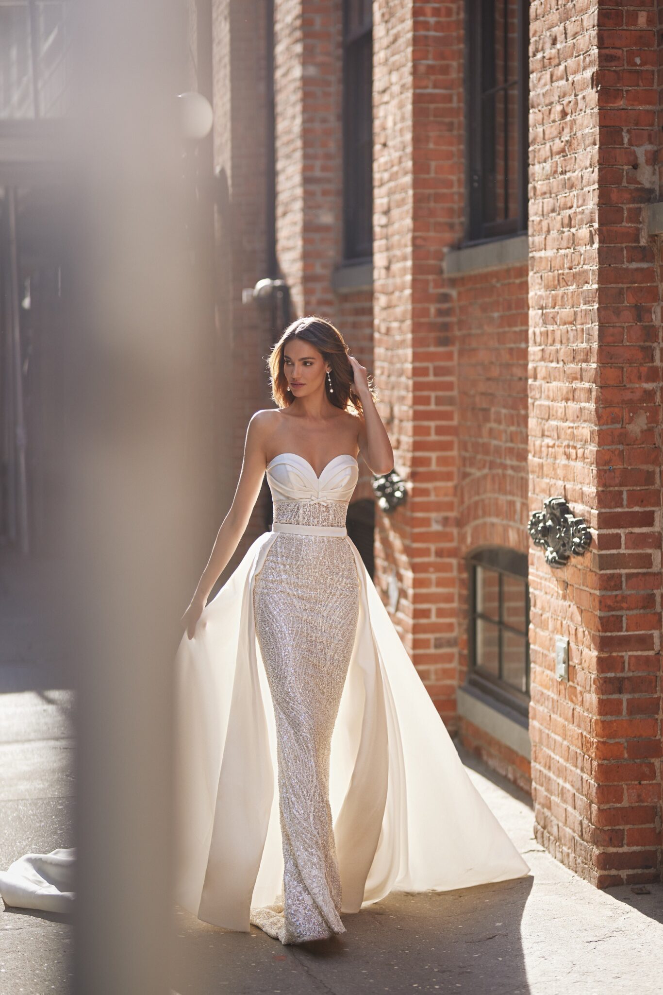 Love in the CityClio is a fantastic transformer gown with a detachable cape of glossy satin. He sheath dress is all embroidered with shining sequins, it has Straight fitted style amd a small train. The strapless top has a sweetheart neckline and is decorated with satin folds and small bow. The train is fixed on the waistline adding solemnity to the look.