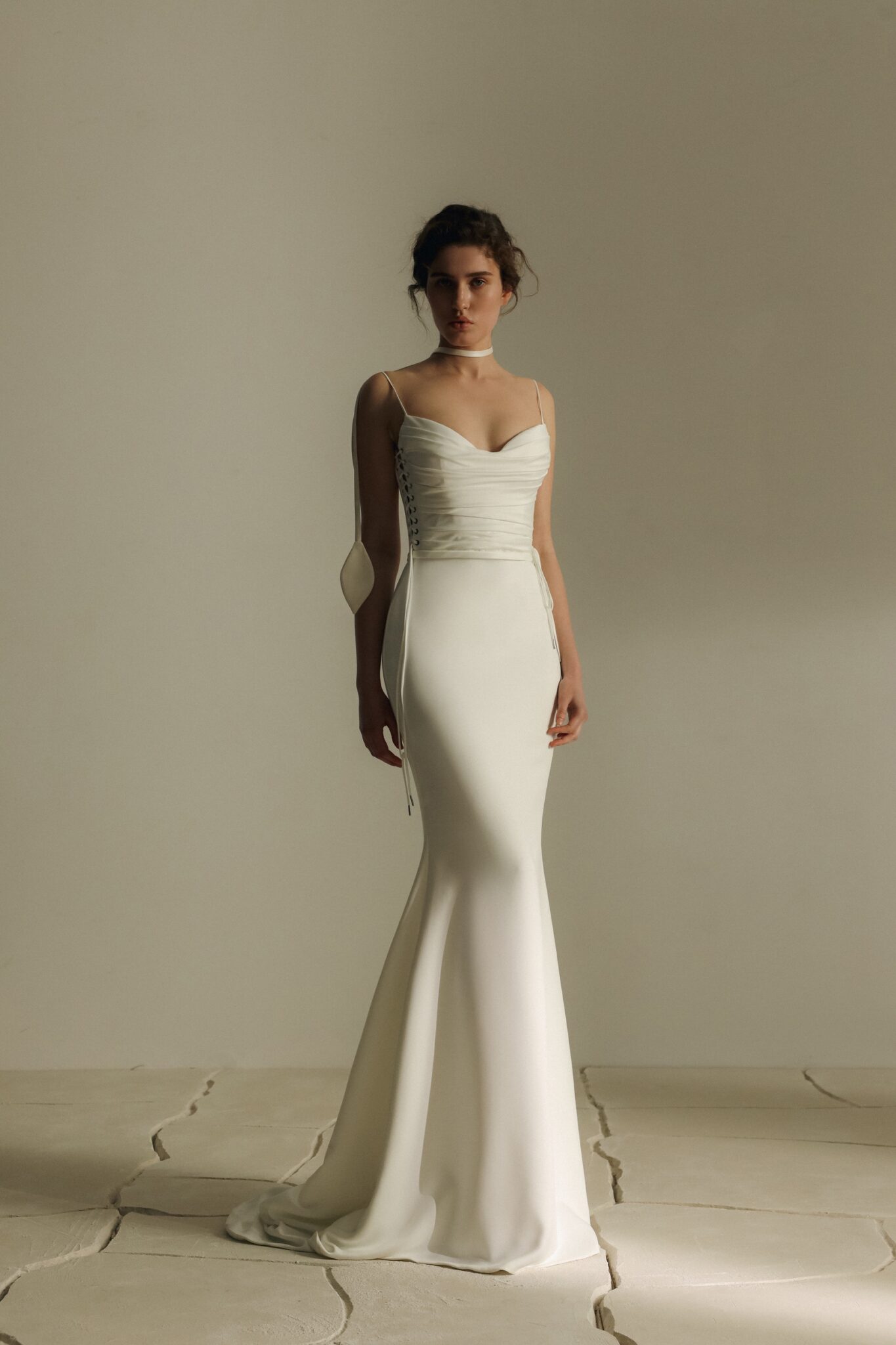 A distinctive feature of the dress is the side lacing detail — eyelets with satin cords on both sides of the corset, adding a subtle, fashion-forward twist to the minimalist design.
