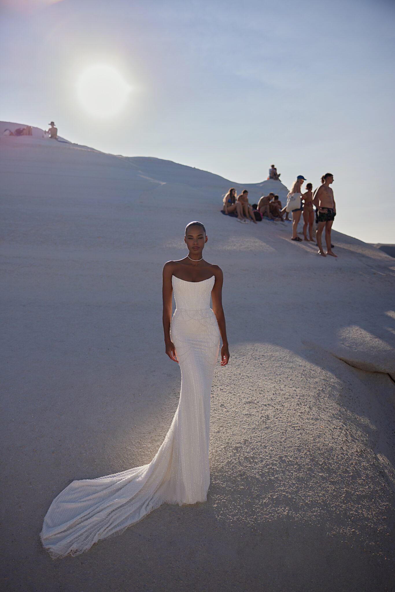 Venus, Plus SizeClassy trumpet dress with meticulously sparkling embroideries all over the dress, creating a striped effect and resembling seashell shapes descending from the waistline. The boat neckline gives the style a touch of simplicity, while the train flowing from the back makes the outfit even more delicate.