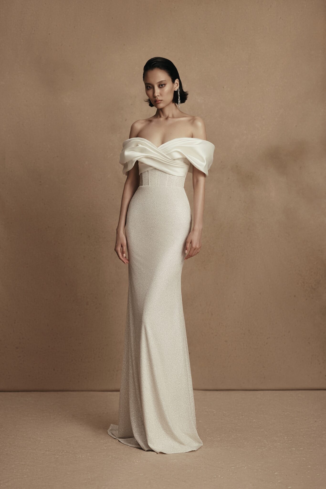 PersonalityA gown is made of mikado and sparkling fabrics. A dress with lowered shoulders is decorated with a wrap on a decollete that runs on the back. Cornelia gown creates a feminine silhouette and highlights the bride’s waistline. The exquisite additional skirt made of mikado fabric is fixed on the waists and has a long train. A sheath dress can be made of soft Mikado silk solely.