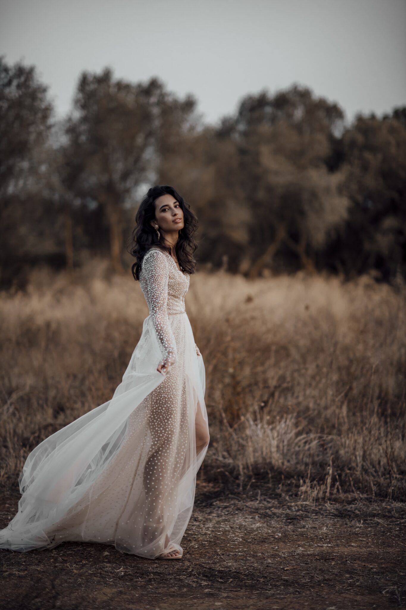 Love stories, Plus SizeCorsica bridal gown looks light and airy. The main part of the dress is made of sheer veining with a special ornament. The skirt is completed with a veiling layer. Long sleeves and low neckline make this look more feminine.