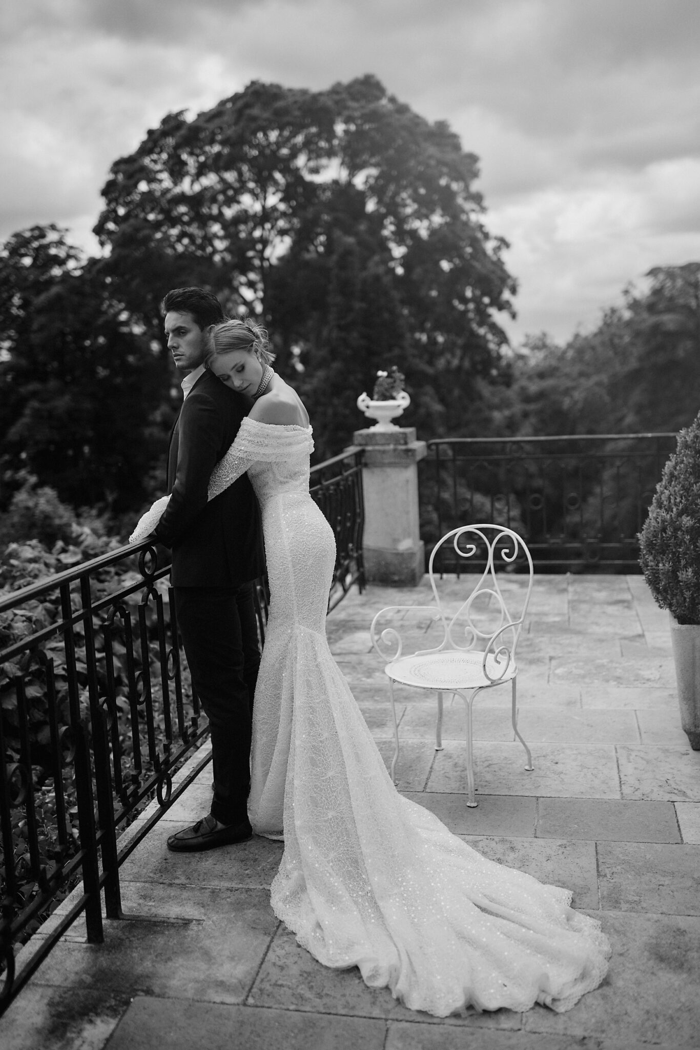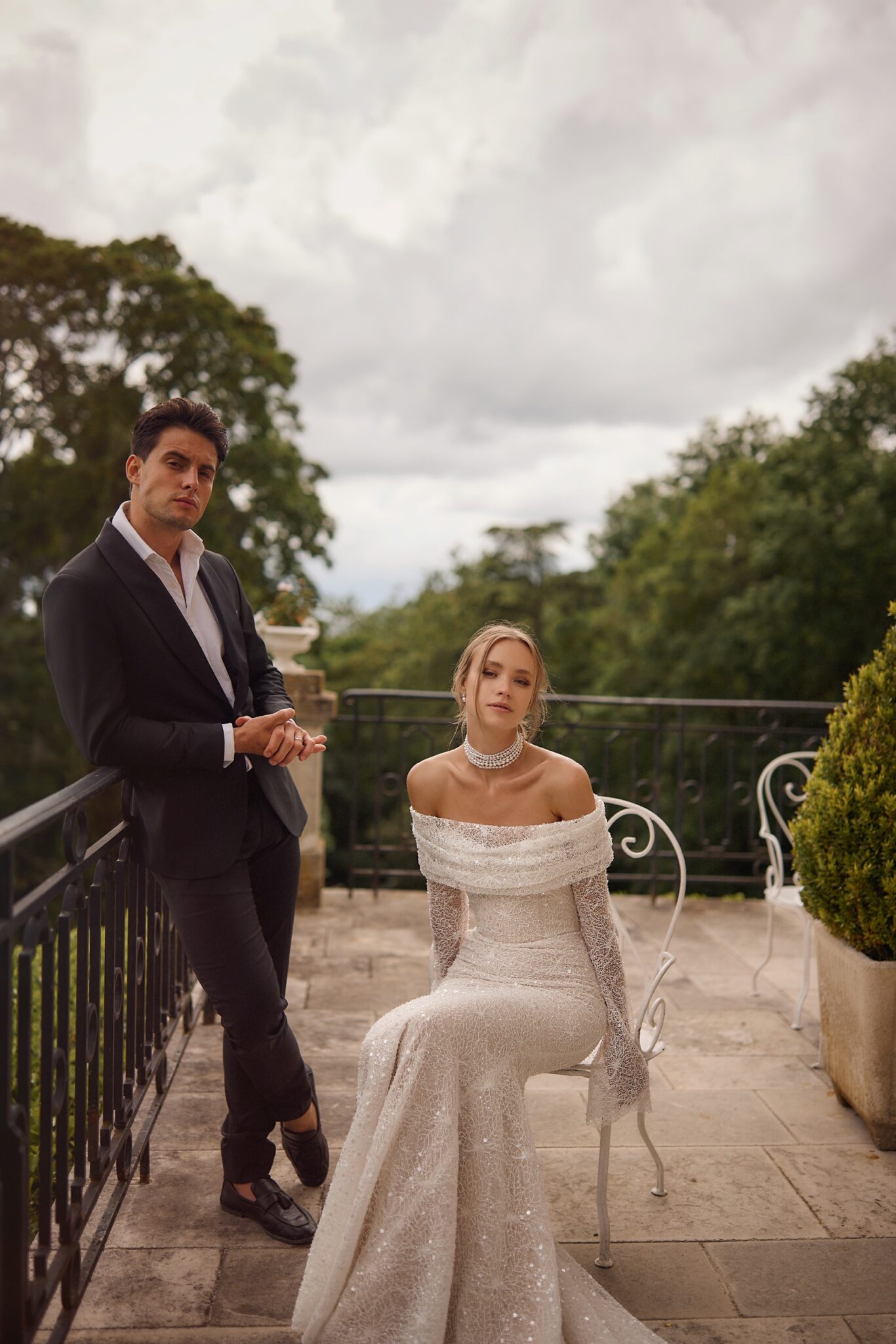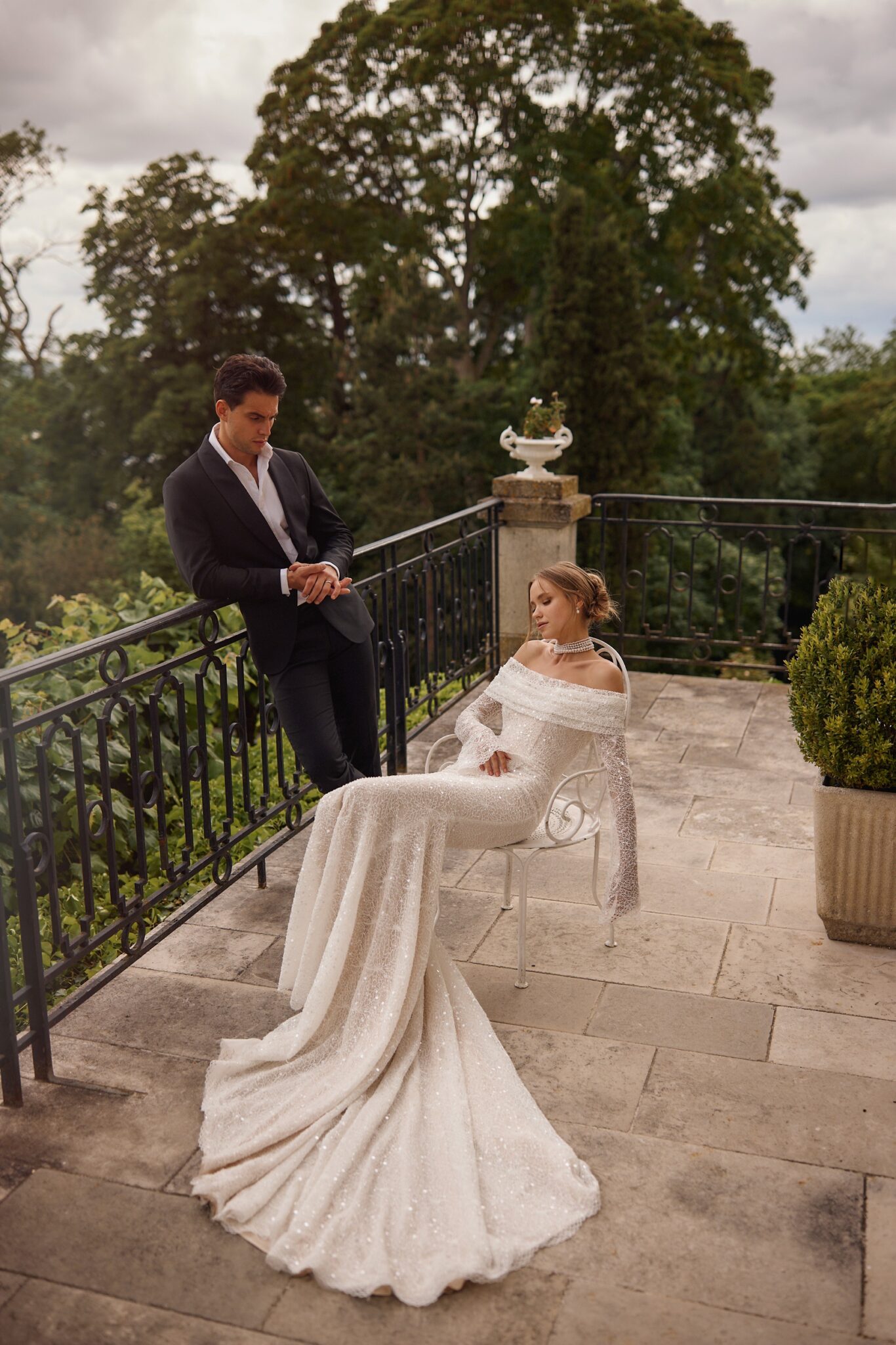 Love StoryCold-shoulder mermaid silhouette dress featuring long funnel sleeves with lace-decorated loose cuffs and sophisticated beaded floral embroideries all over the dress to add a stunning visual effect.