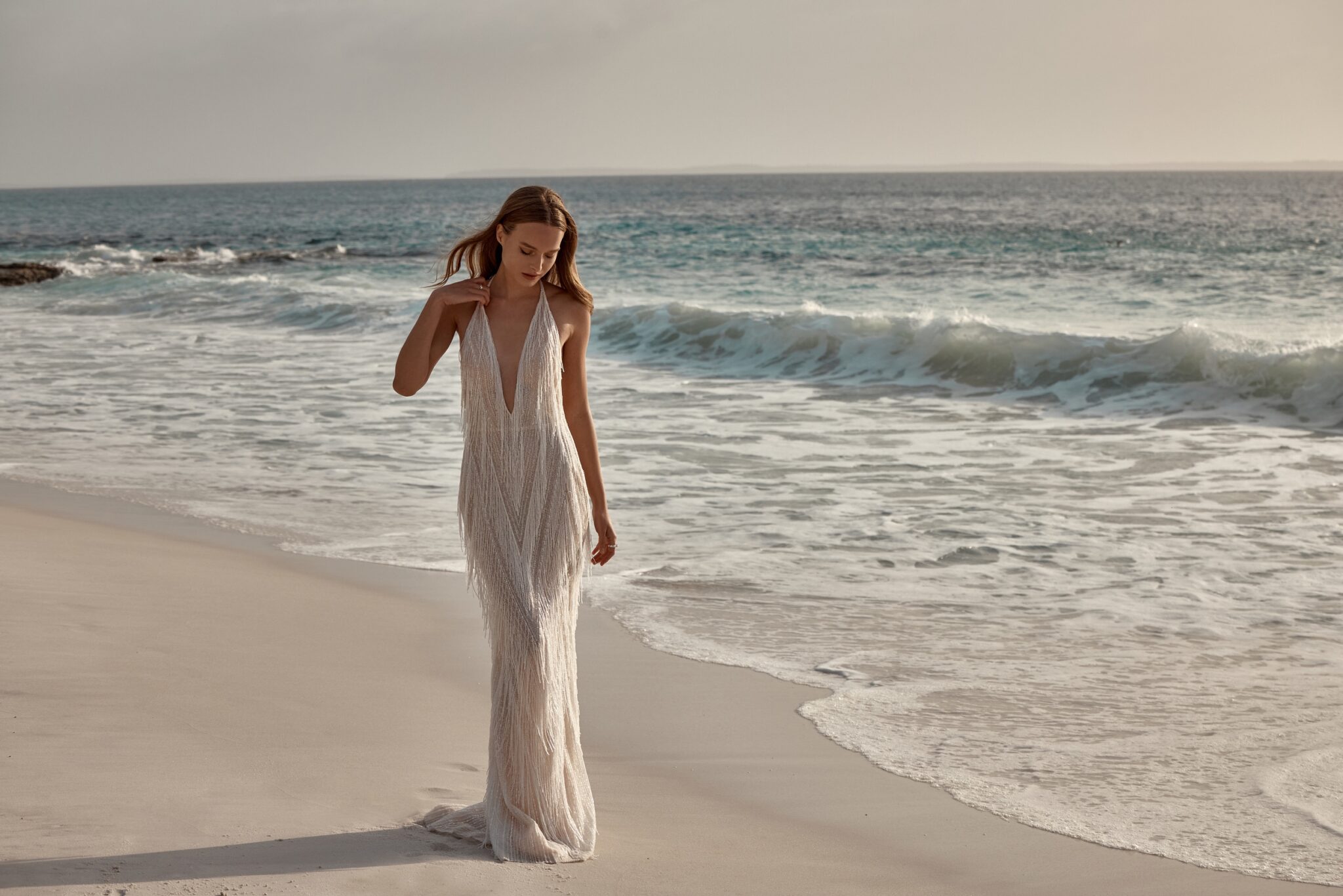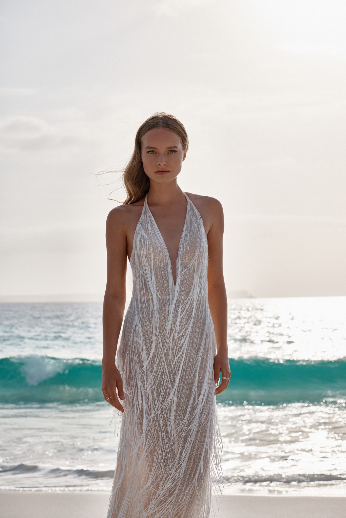 Atelier signature editionThis backless wedding dress exudes modern glamour with its sheath silhouette and all-over fringe beading, making a bold and striking statement, perfect for the confident and stylish bride. Each step creates a mesmerizing shimmer, making it perfect for the bride who loves to stand out. It’s a bold choice for a confident and stylish bride ready to make a statement on her special day.