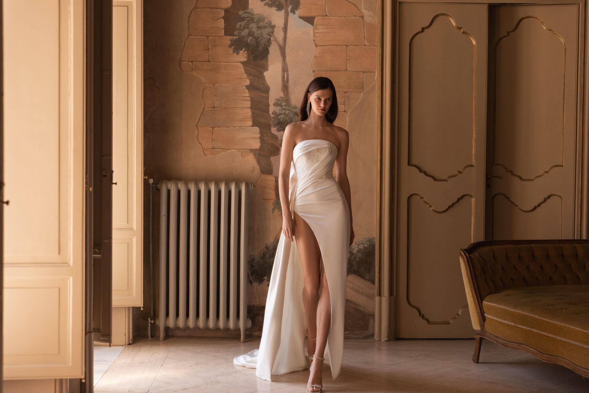 PalermoSleek and youthful satin dress constructed by a clean lined skirt paired with a Straight across sequined corset top which frames the shoulders with asymmetric satin ribbons. The skirt features a seductive thigh-high slit that proceeds to the sweeping chapel train.