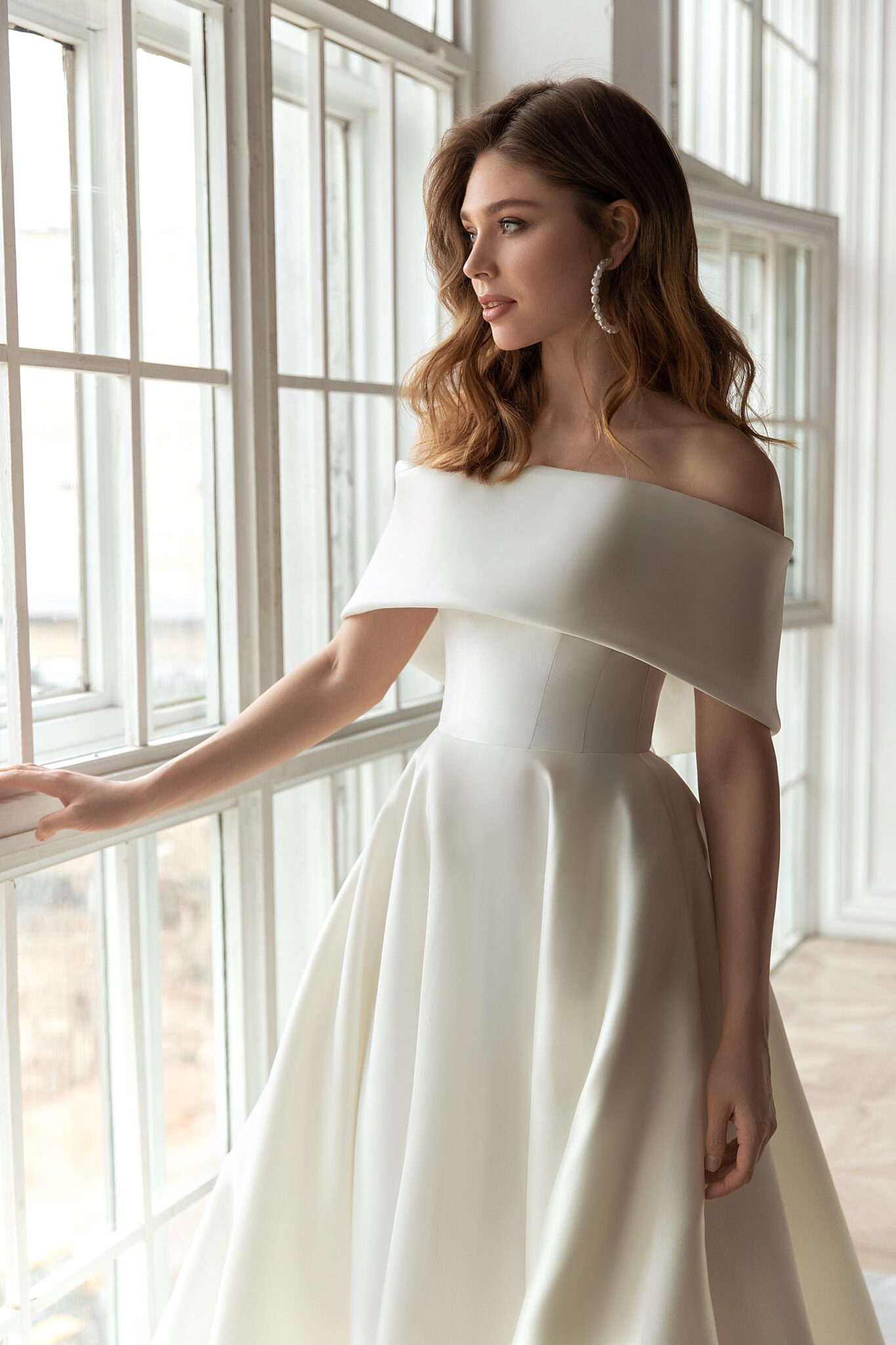 Less is more 2021Dana is a magnificent and elegant A-line satin wedding gown that creates a royal look. It is made of glossy fabric. The dress with lowered shoulders is embellished with falbala that has pointed angles at the back of the dress. A fantastic skirt passes into a long train that adds solemnity to the outfit.