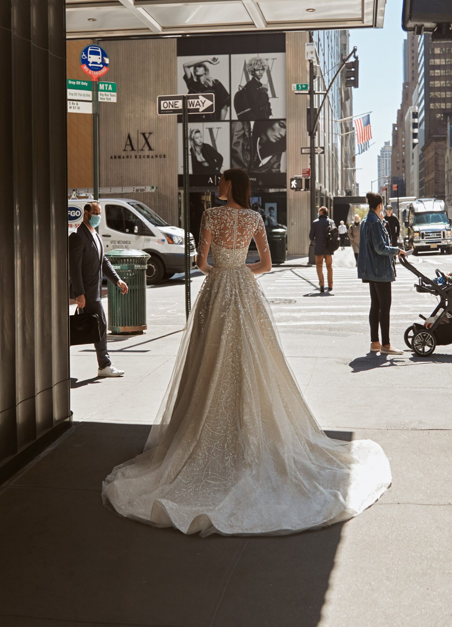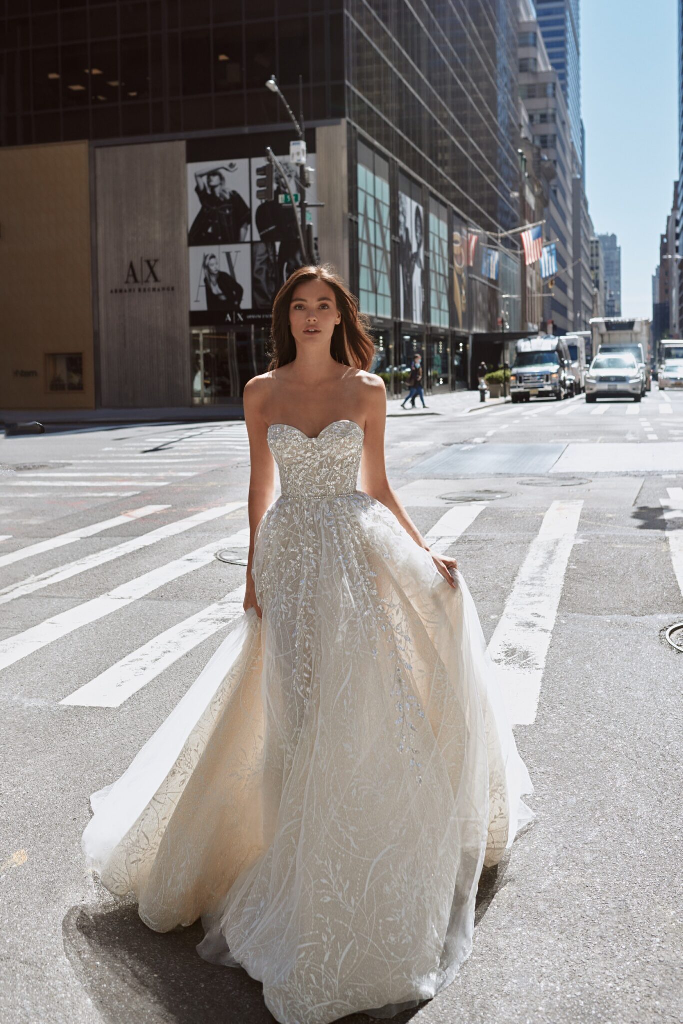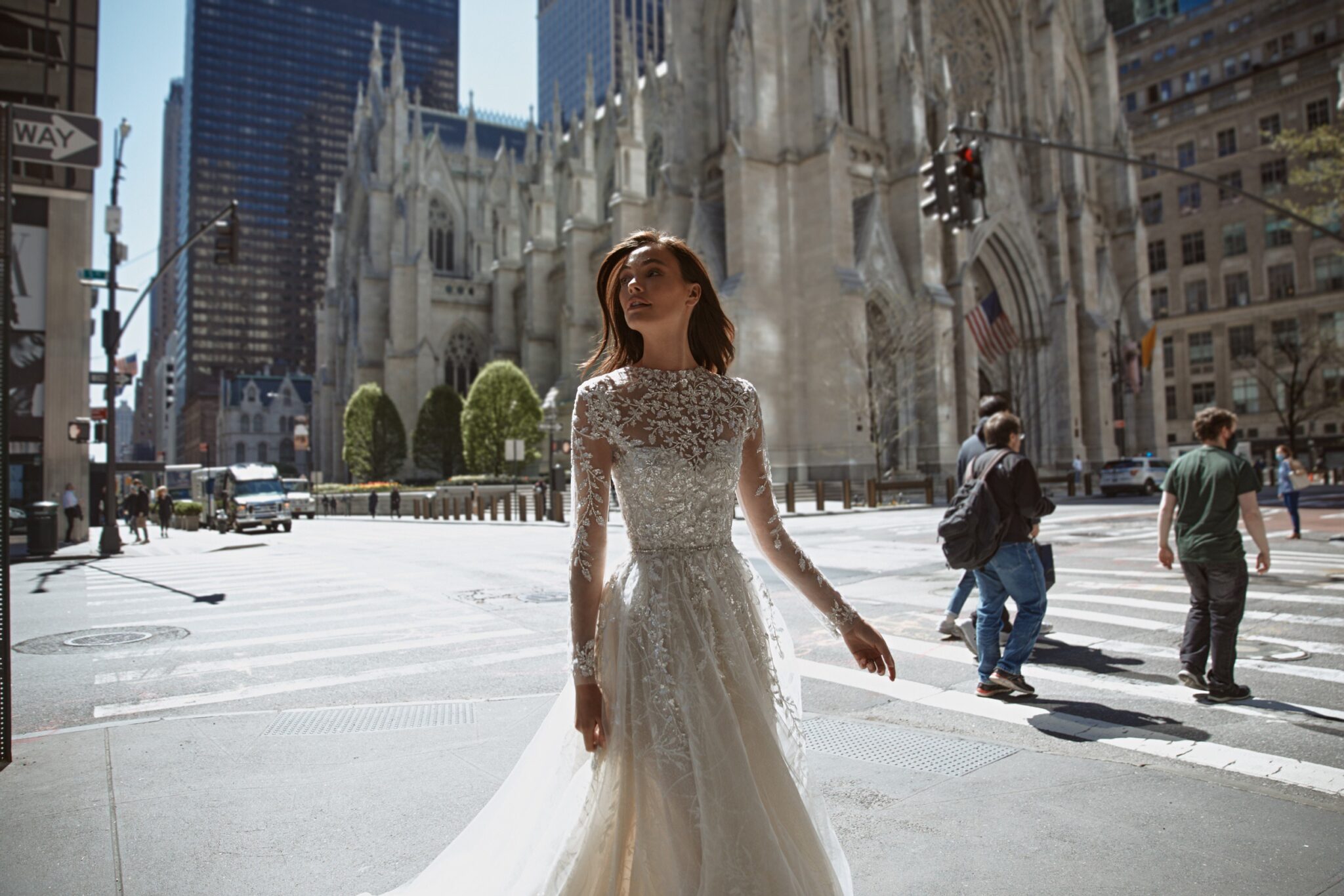 Love in the CityDara is a tender and exquisite gown. The main dress is an A-line one, decorated with embroidered lace, sparkling sequins and patterned Tulle. The dress is accomplished with a detachable bolero made of shinig embroydered lace with collar neckline and long sleeves. The bolero is fastened on the back with a set of small Buttons.