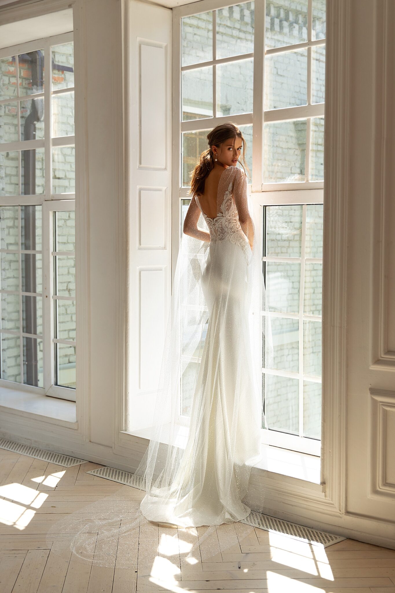 RomanceDayana is the laconic and exquisite A-line wedding gown. The upper part of the dress is decorated with a V-shaped neckline. The corset is entirely embroidered with loose flowers, beads, spangles, and crystals. A fitted skirt passes into a long train.