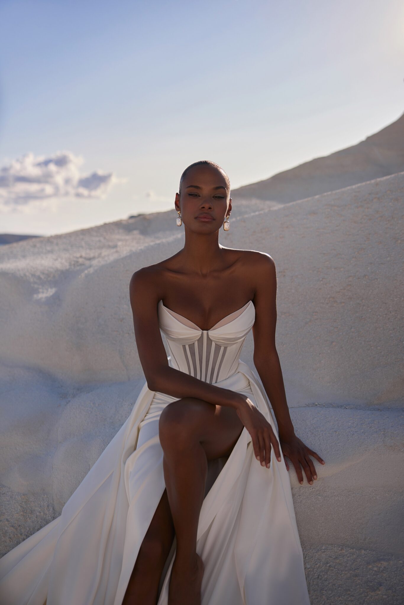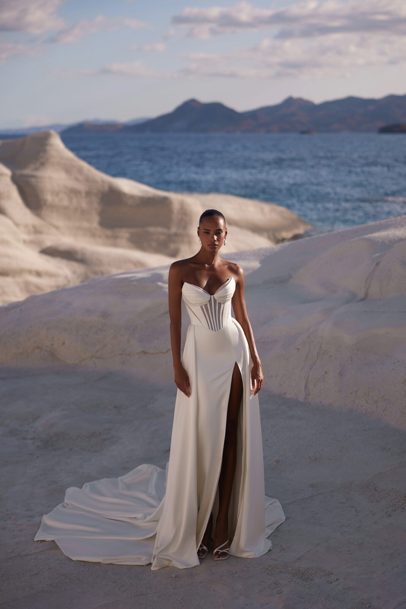 Venus, Plus SizeSweetheart corset dress featuring a reinforced bodice and a sleek silhouette. The skirt softly hugs the hips and features a slit on the left side. While the upper skirt is attached to the back, descending into a train.