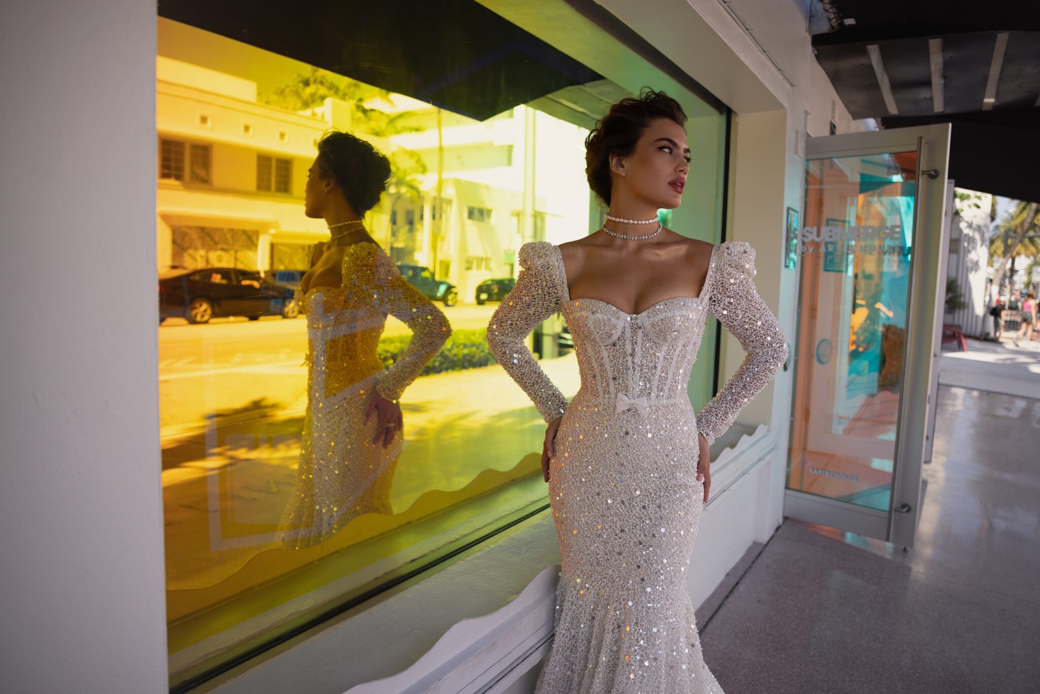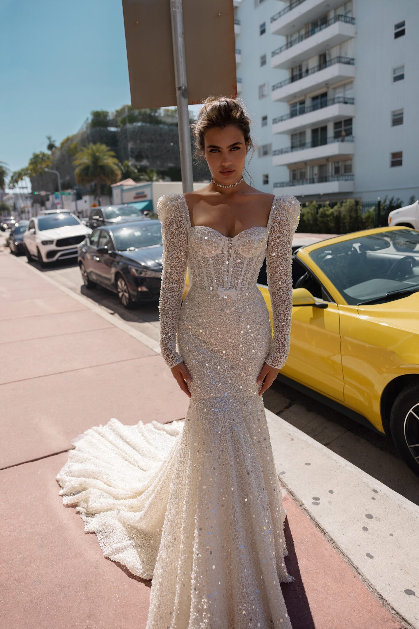 Miami BlissDazzle in this exquisite mermaid dress, adorned with intricate beading and sequins on delicate lace. Featuring a stunning sweetheart neckline and elegant long sleeves with pop-ups, this dress exudes sophistication and glamour. The figure-hugging silhouette flares out into a breathtaking mermaid skirt, making it the perfect choice for a formal ceremony. Embrace your inner goddess and steal the show in this breathtaking masterpiece.