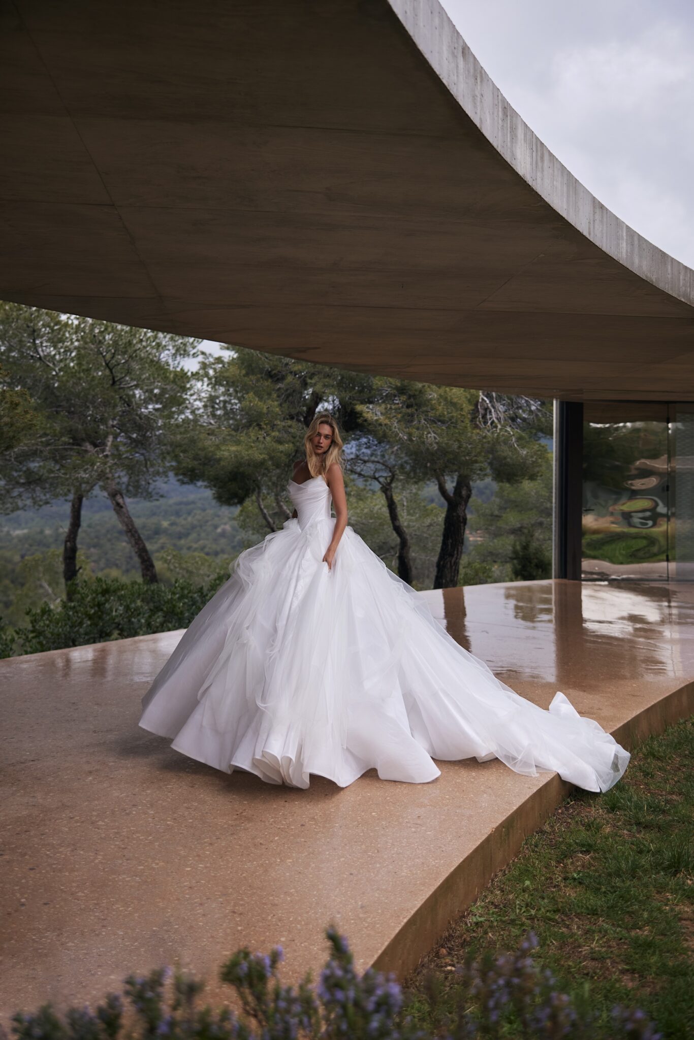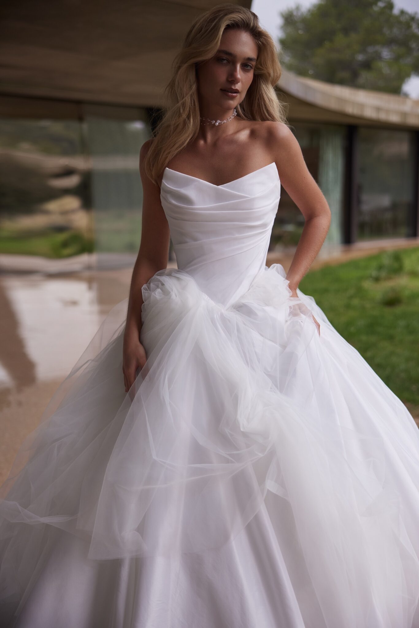 A standout feature of this gown is its removable tulle overlay, which is attached with discreet snap buttons. With just one simple change, the dress transforms into a more classic, giving the bride two stunning looks in one.
