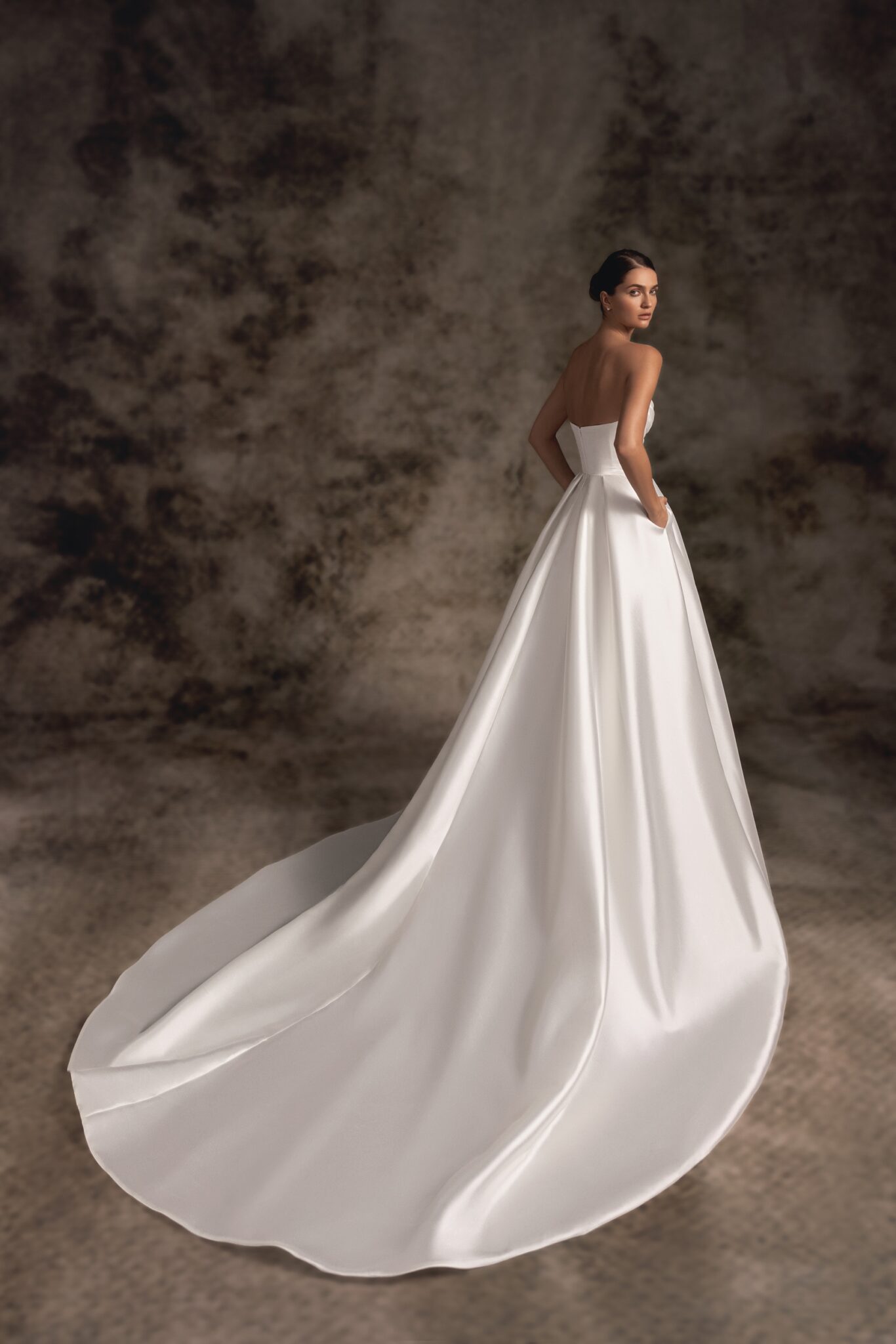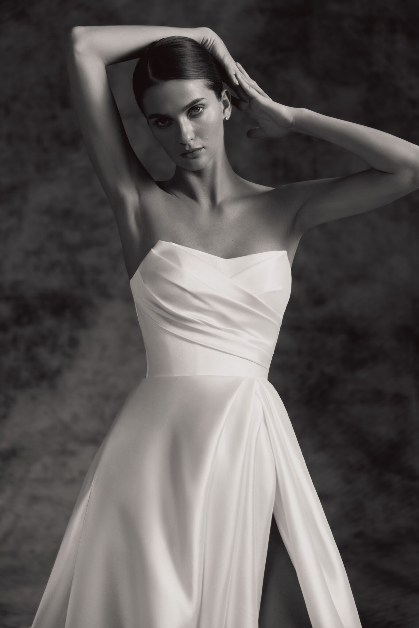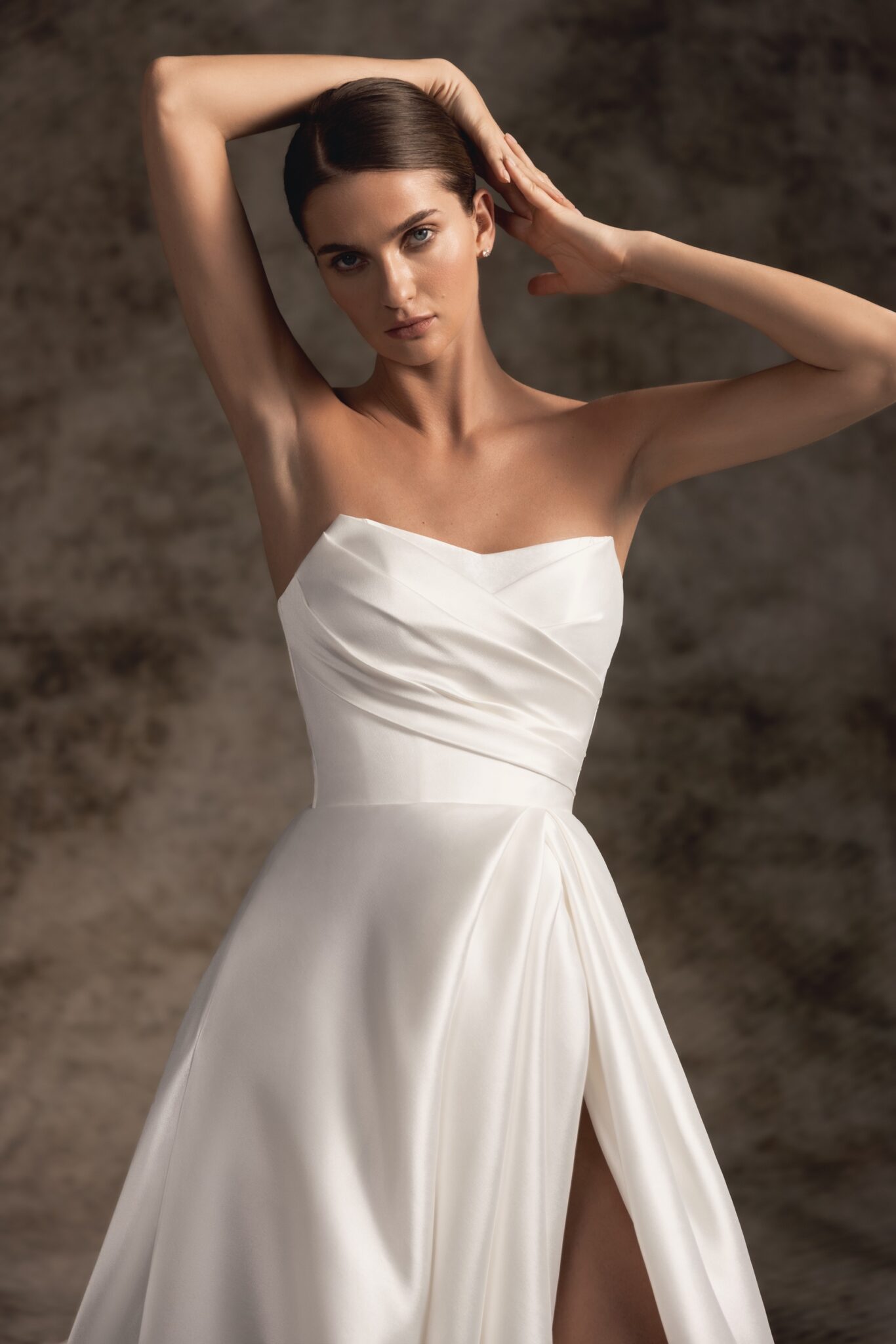Notte d'Opera, Plus SizeAn absolutely showstopping sheer satin wedding dress with asymmetric sweetheart strapless corset. A draped skirt with a thigh-high slit proceeds into a dramatic, pointed cathedral-length train for a really memorable moment.