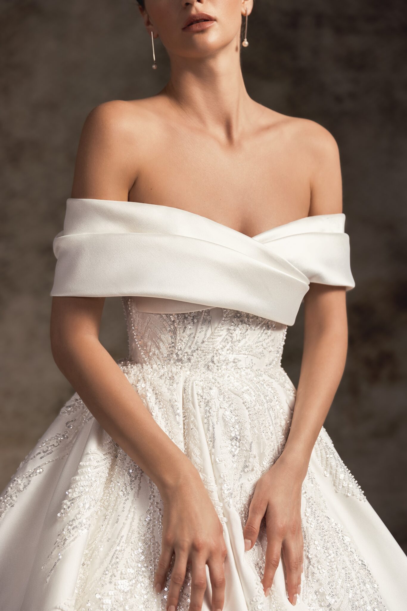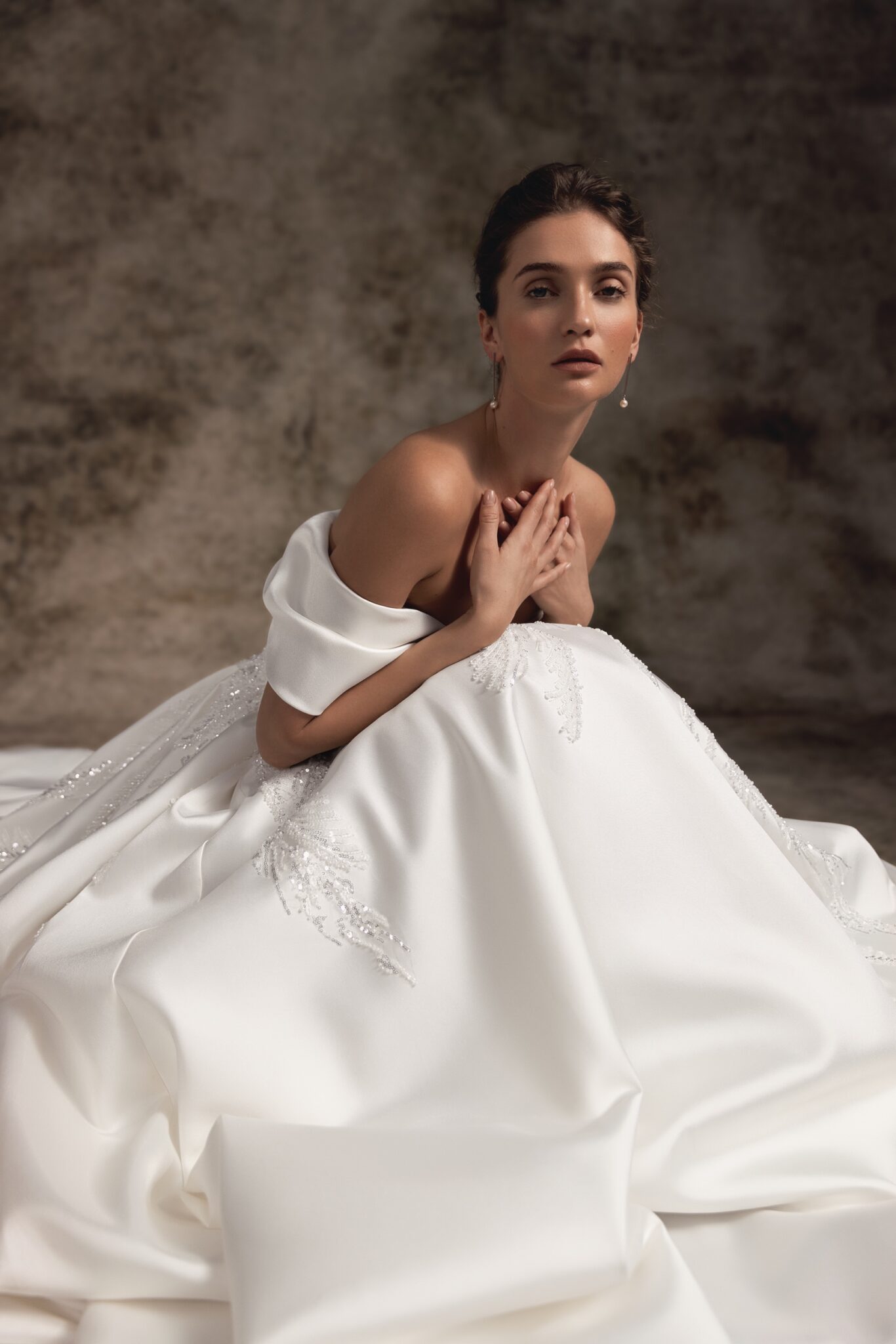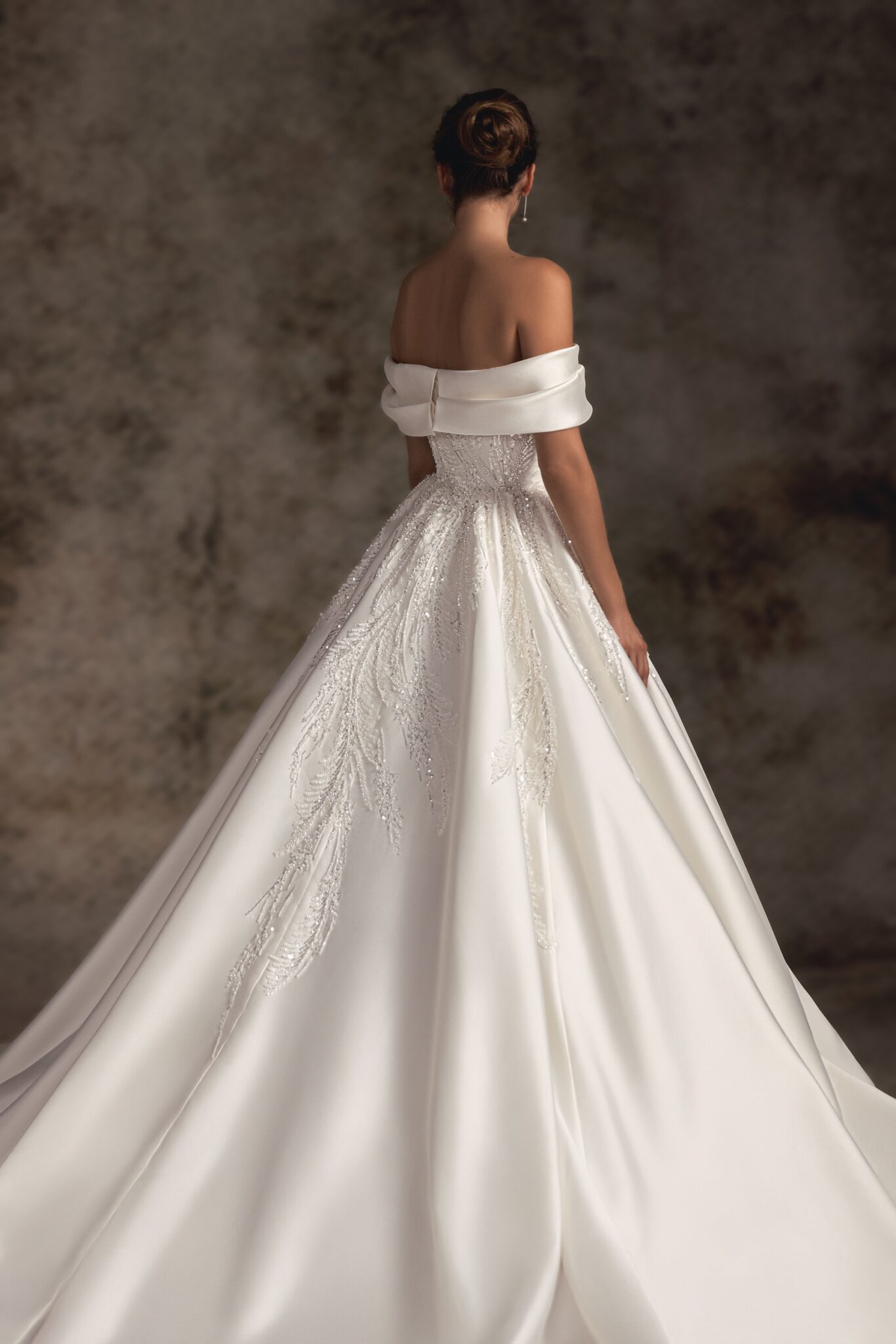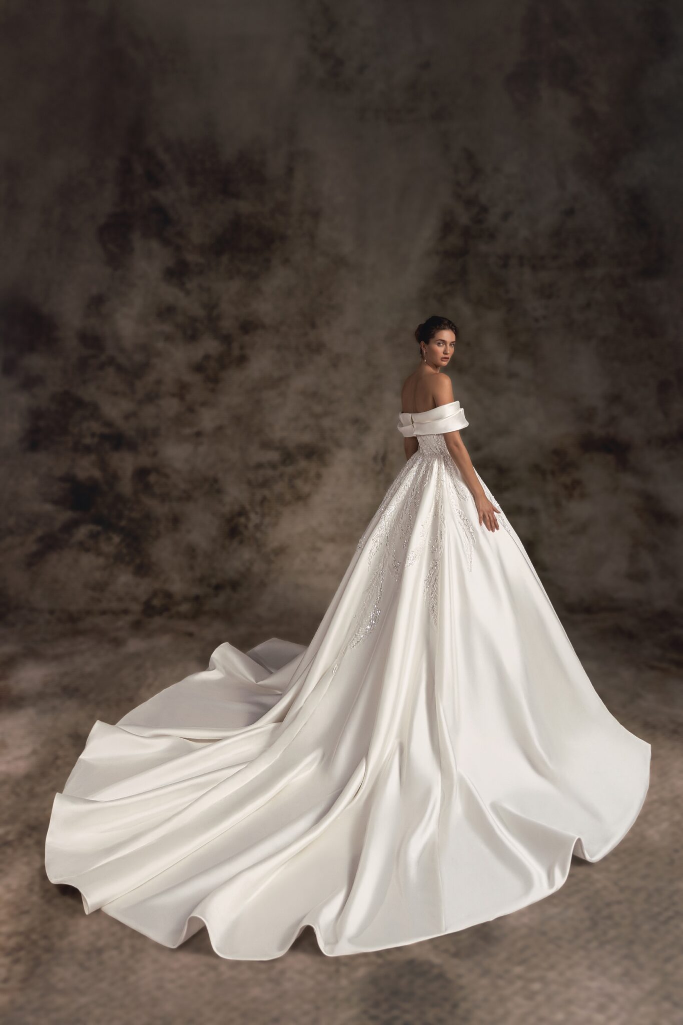 Notte d'Opera, Plus Size, Sample SaleThis statement satin ballgown is adorned with delicate hand-made embroidery with a gorgeous off-the-shoulder wrap neckline that proceeds to the back with two soft folds. A super-fitted chic corset top proceeds to the voluminous full satin skirt completed with a pointed-tail train.