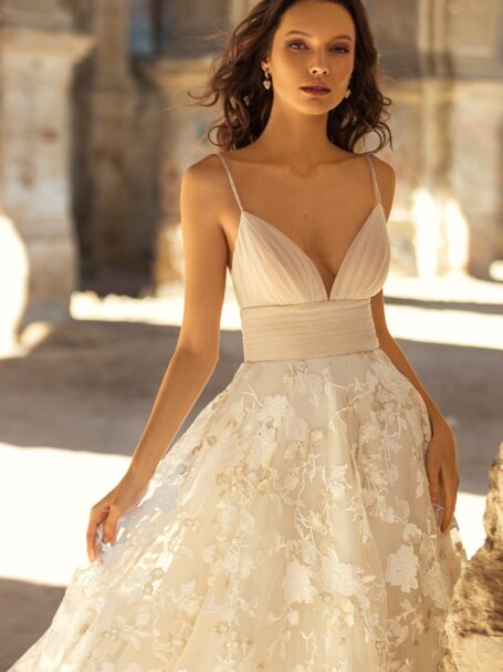 Golden HourDixie gown is combining a trendy square neckline and unique lace decorated with leaves pattern. The dress is made of tule and decorated with a dedicate shiny belt.