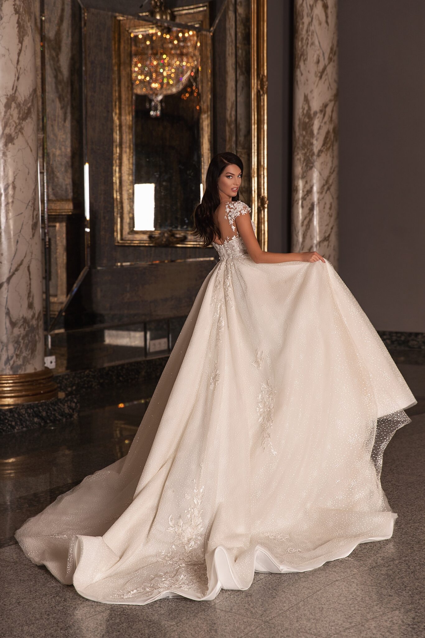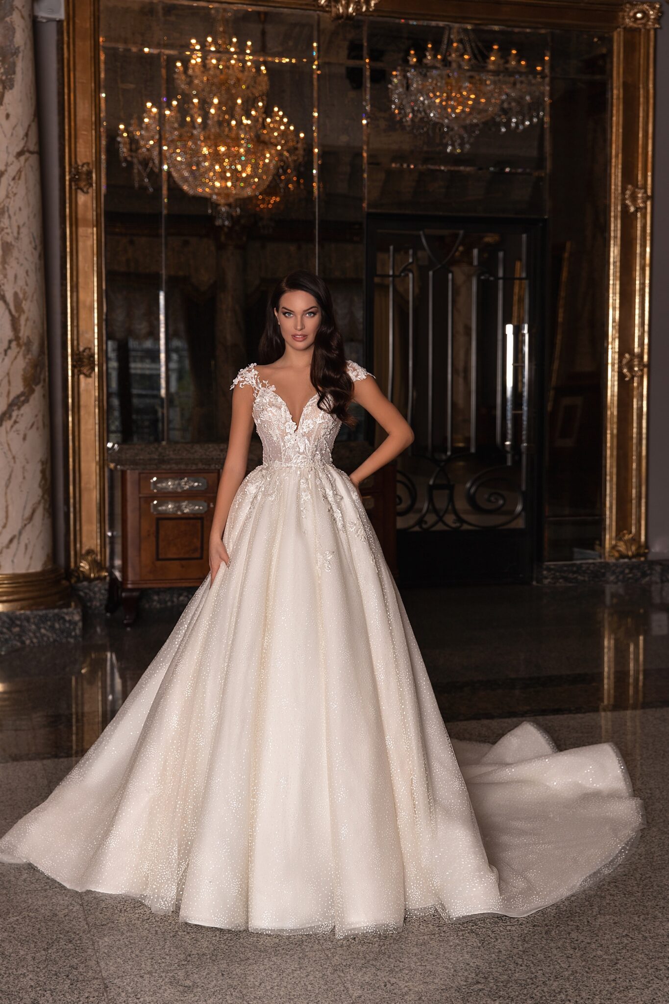 EdemA-line Dolores wedding dress is embellished with V-shaped neckline and cap sleeves. The bodice of the dress and sleeves are decorated with loose flowers. The fantastic neckline at the back of the dress draws attention. A skirt is made of satin and covered with a layer of transparent fabric with small Buttons. Moreover, the skirt is embellished with lace ornaments at the back and passes into a train.