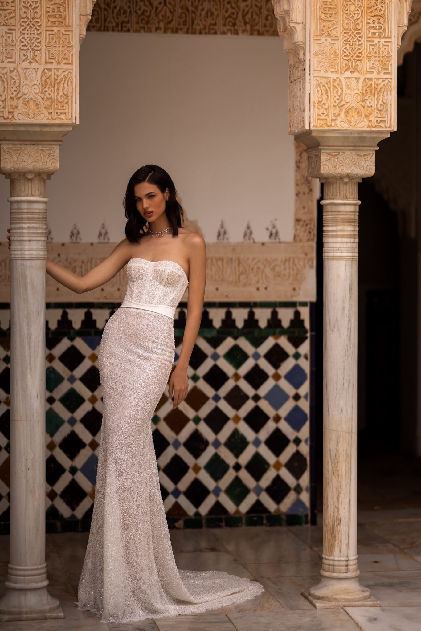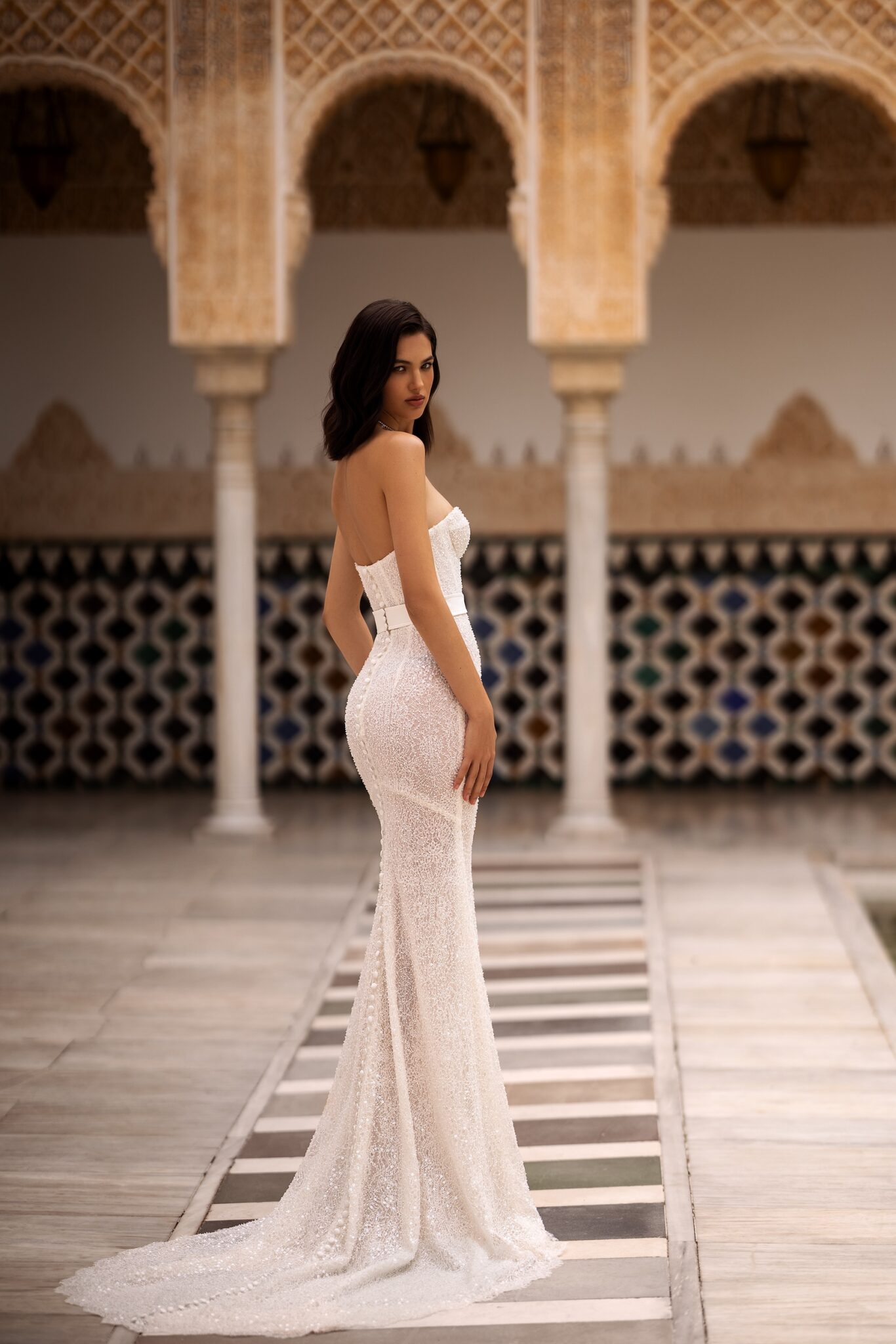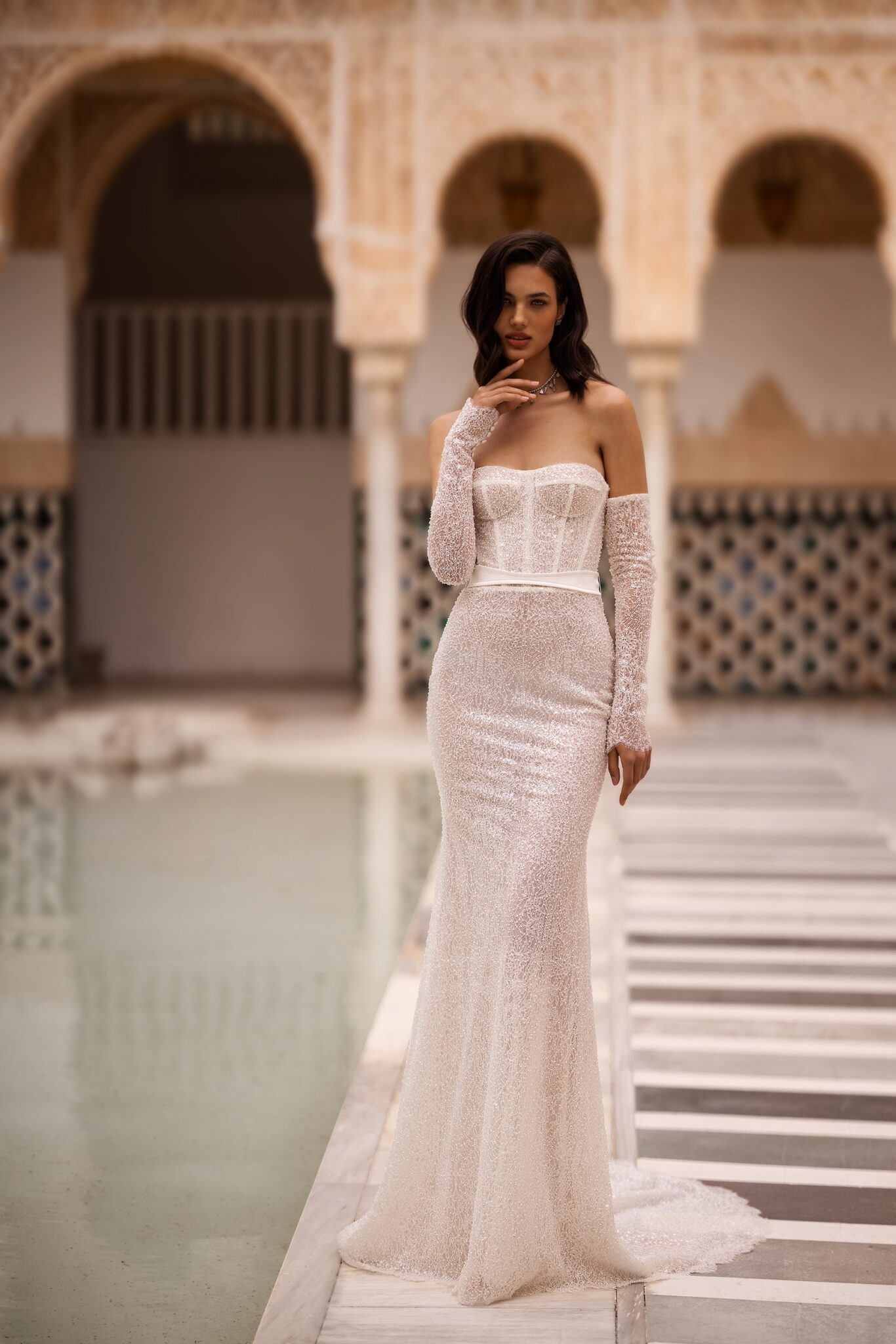 Alma de OroIntroducing our enchanting mermaid wedding dress, a true masterpiece that will leave you breathless. Crafted from luxurious shimmer fabric, it shimmers and glistens with every movement, exuding an ethereal radiance. The exquisite embellishments of pearls and beads cascade down the bodice, adding a touch of opulence and glamour to this mesmerizing gown. The sweetheart neckline accentuates your curves and frames your décolletage, evoking a sense of timeless romance. For added versatility and personalization, the dress features detachable sleeves, allowing you to switch up your look effortlessly. Whether you prefer a classic strapless style or desire the elegance of delicate sleeves, this dress caters to your every desire.