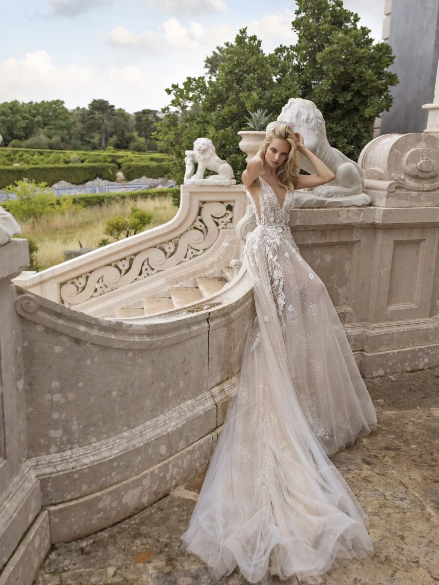 Lisbon VibesTranslucent Elen wedding gown deserves special attention. A corsage on spaghetti straps is entirely decorated with floral lace pattern. The same lace movies are found on either side of a skirt. V-shaped low neck, cuts under arms and fantastic neckline look seductive. A long skirt with a tender pattern is made of translucent veiling.