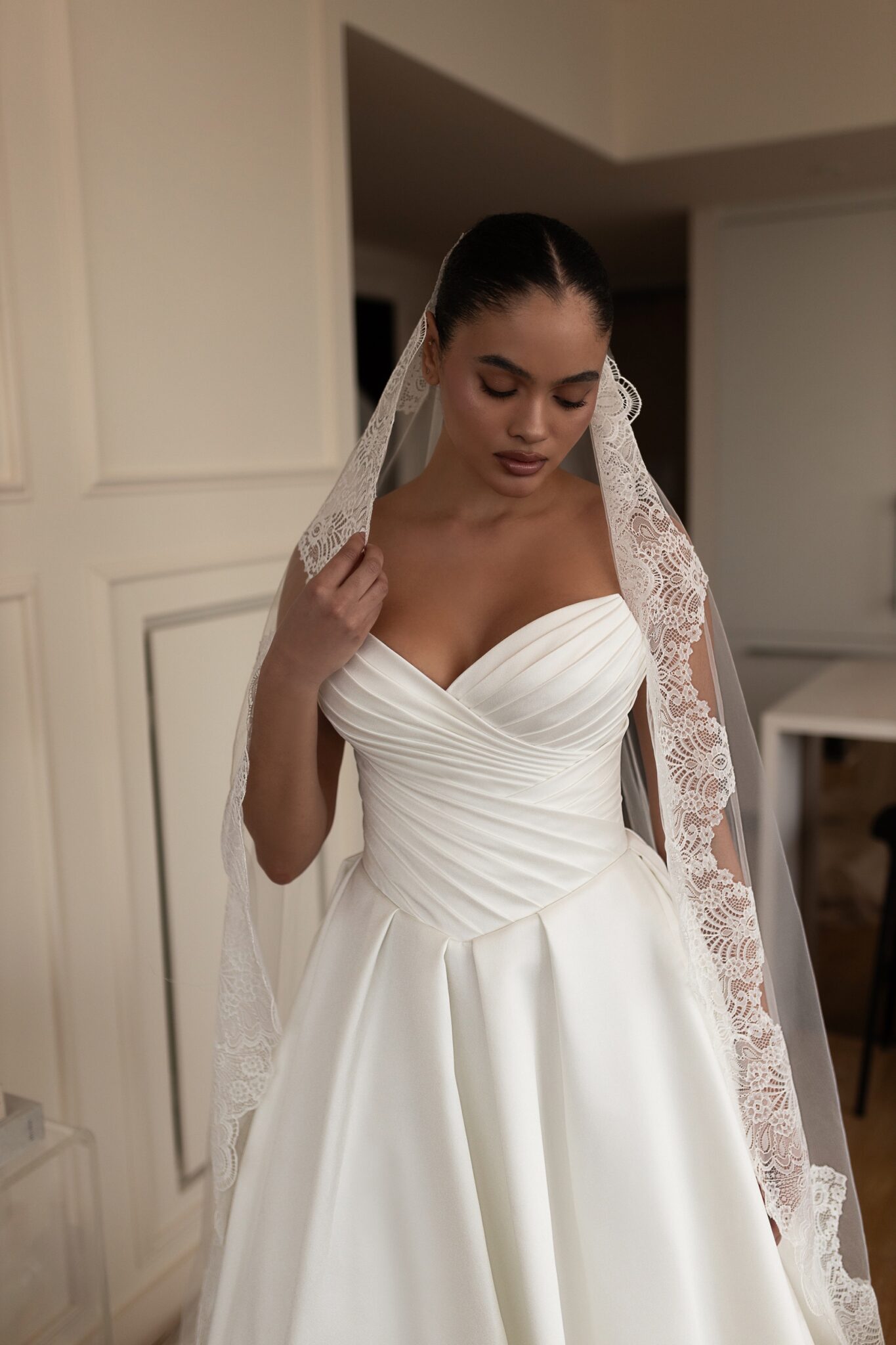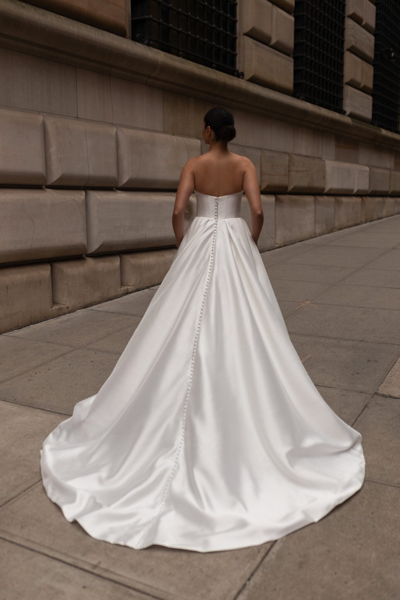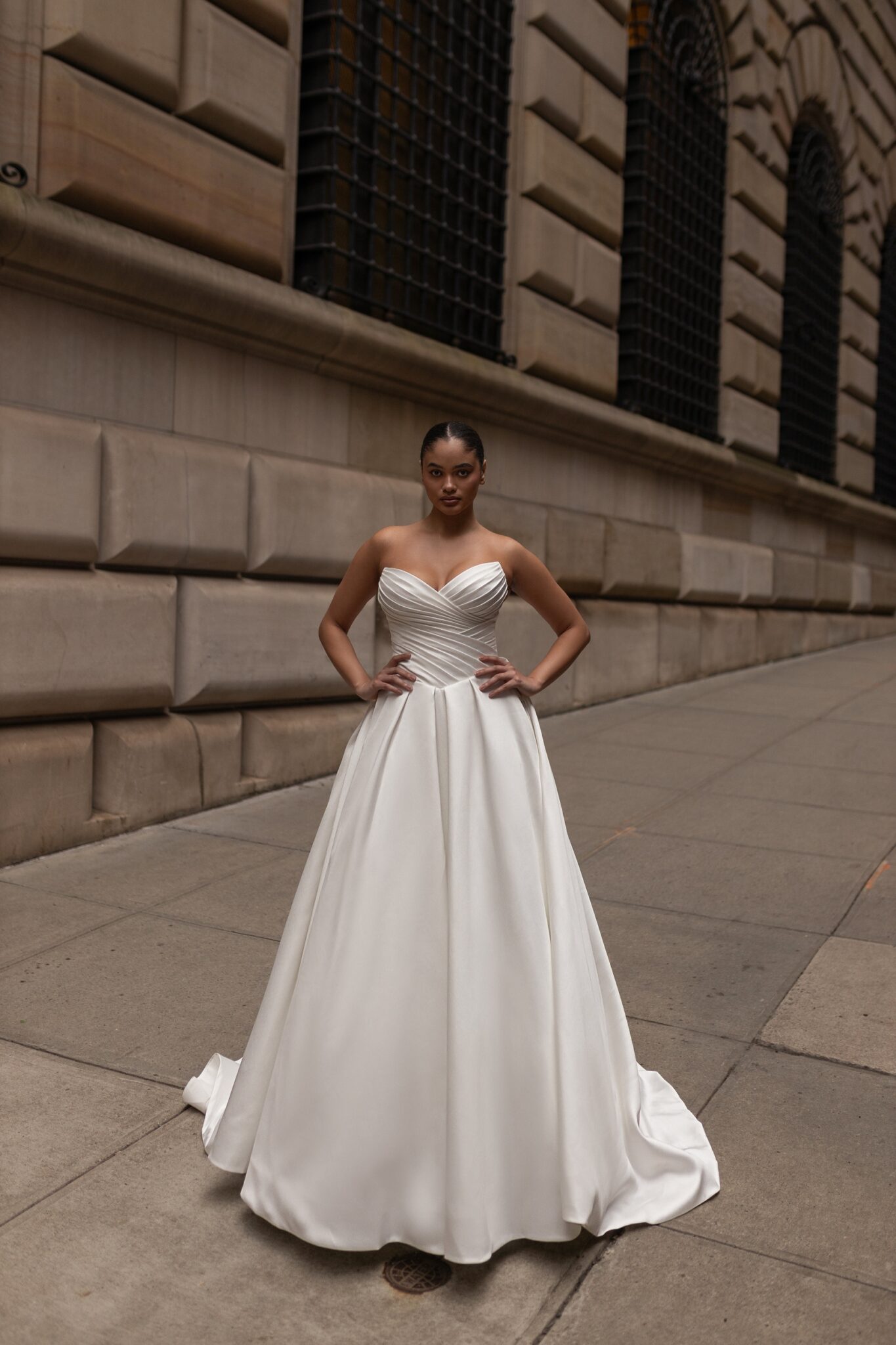 Plus Size, Urban Elegance‘Elise’ is the epitome of striking minimalism. The simple yet structured silk mikado fabric perfectly balances the bold nature of the ballgown silhouette. The bodice features intricate pleated detail, drawing the eye down to the basque waistline. The full, pleated skirt is completed with covered buttons and a cathedral length train to add to the gown’s structural interest.