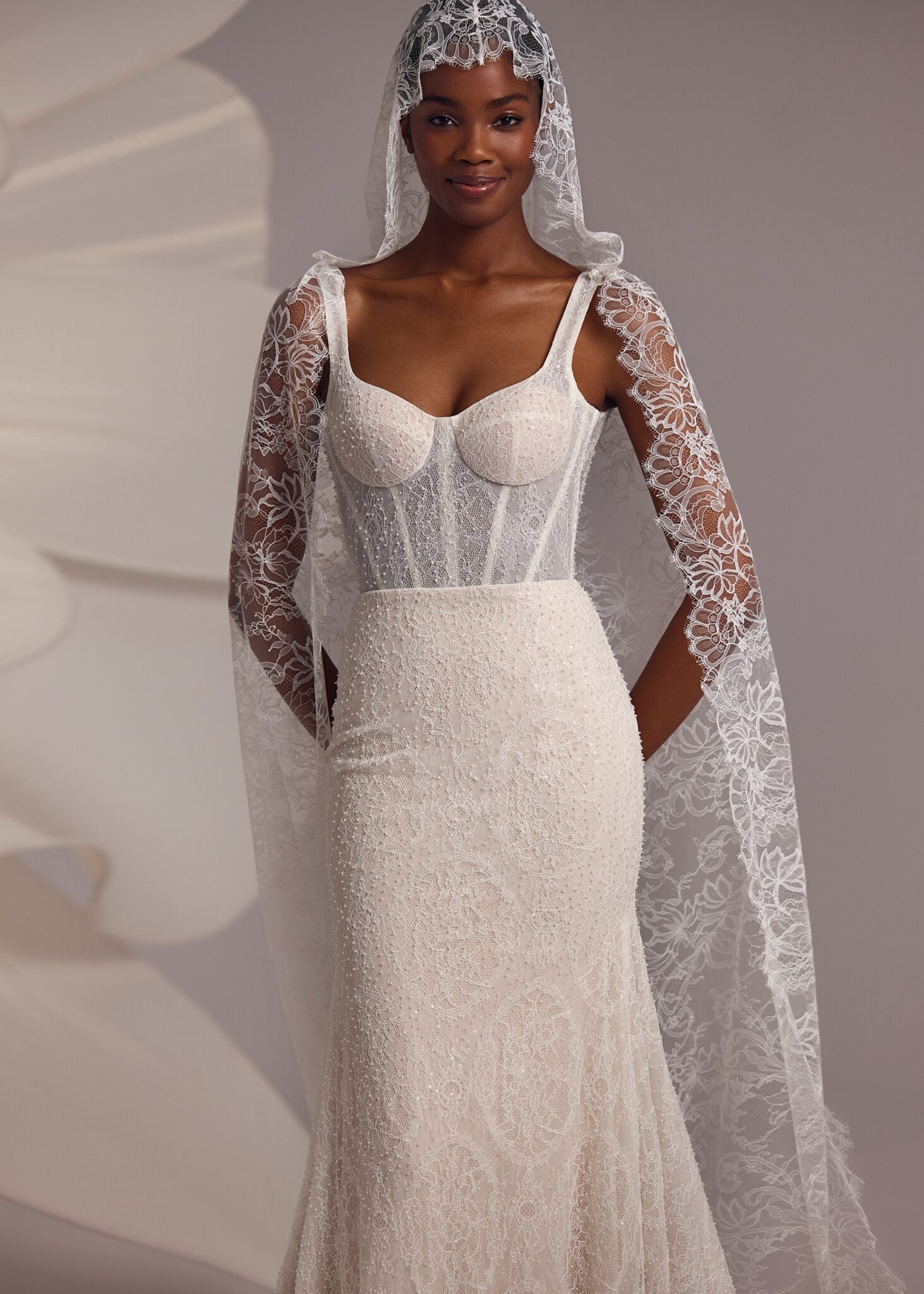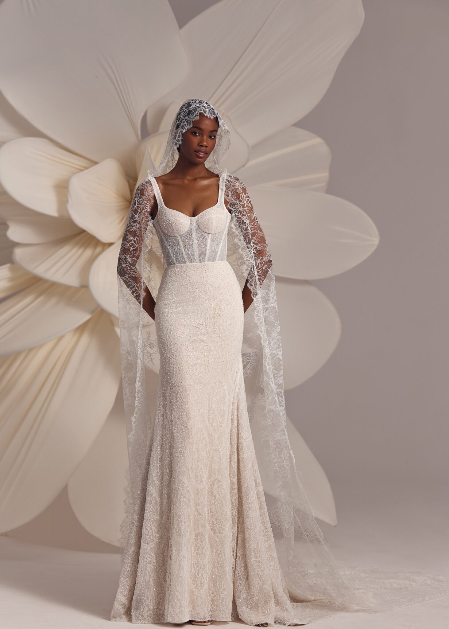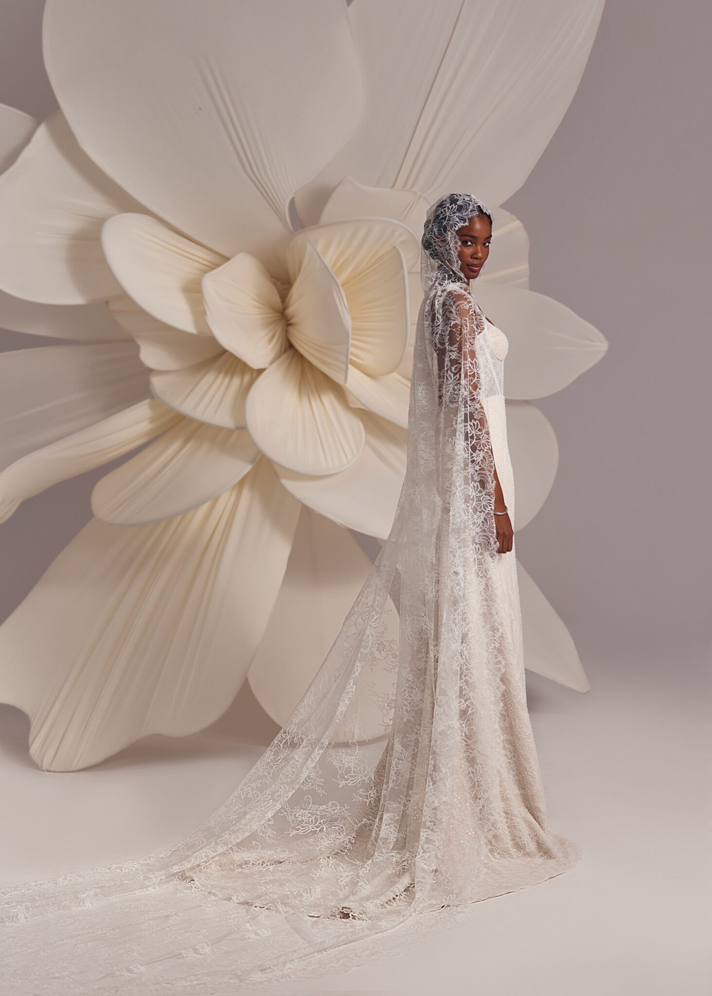 Less is More IVElsie – strapped smooth pointed neckline dress with deeply cutout round back and floral embroidered veil.