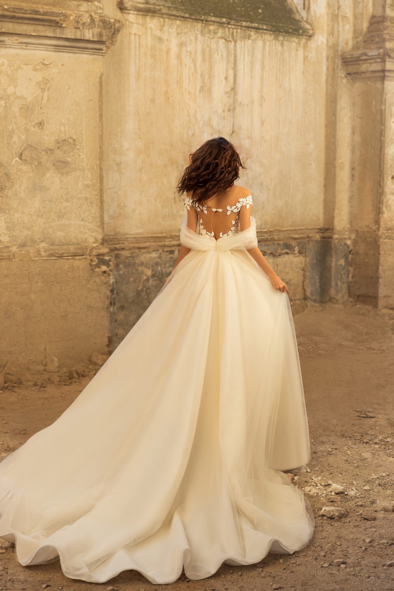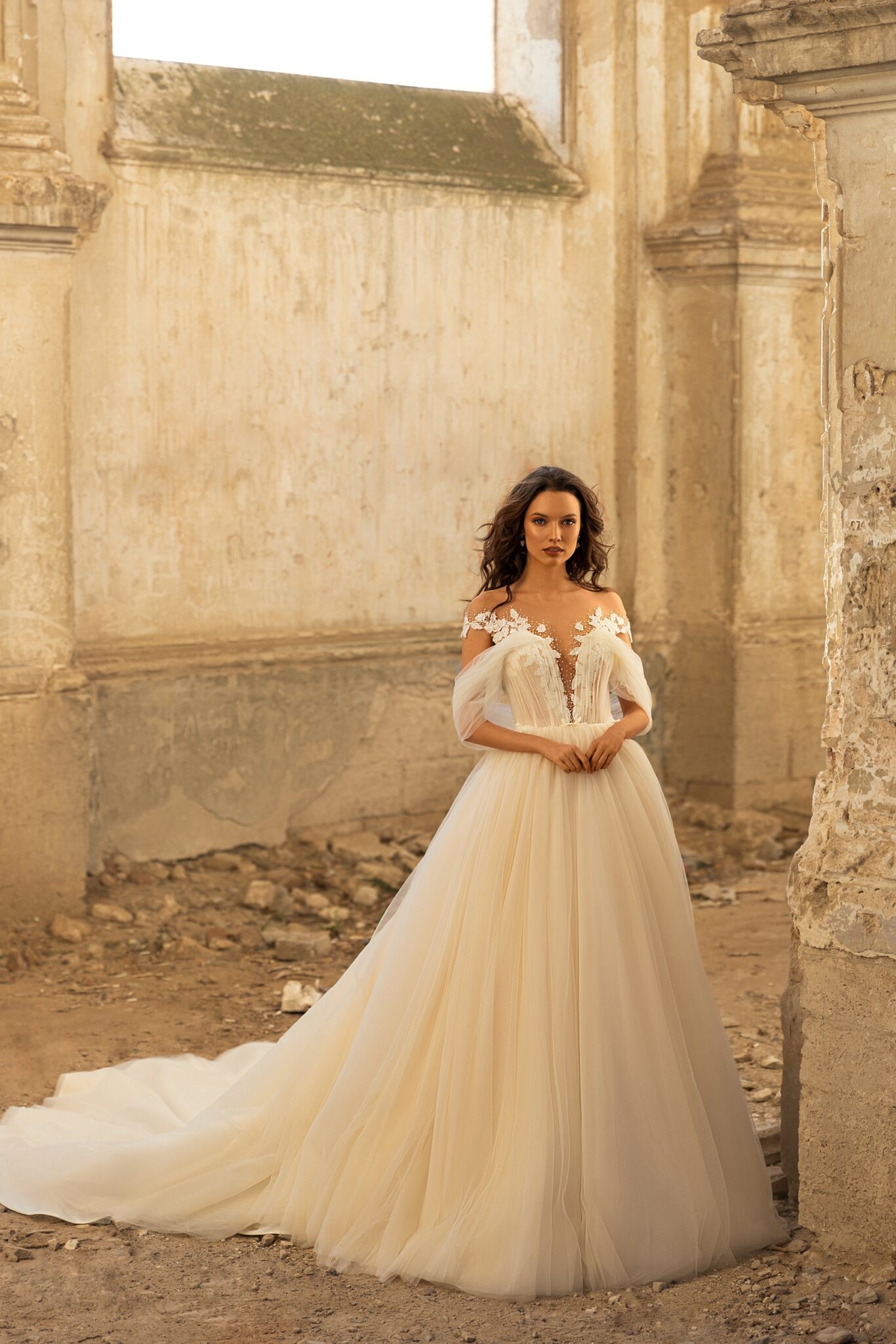 Golden HourA lightweight wedding dress with a sweetheart neckline and unique off shoulders sleeves. combined with lace top. The unique top is perfectly matching simple tule skirt.