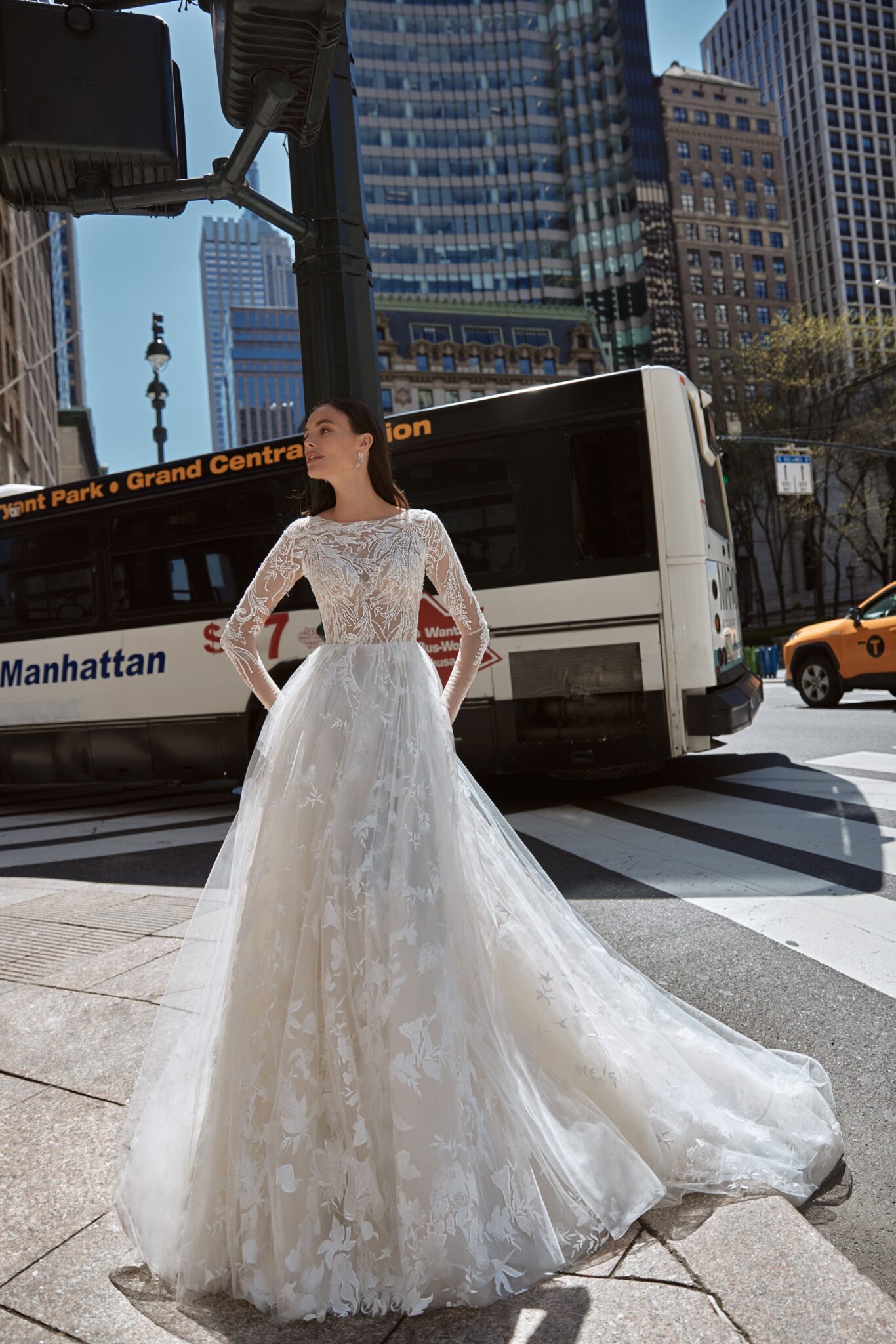 Love in the CityAn exquisite wedding gonw of A-line silhouette. The upper part of the dress is made if translucent lace that is decorated with beads and floral pattern. The decollete as well as the back are Closed and the sleeves are long. The skirt is made of numerous layers of Tulle with floral pattern and ends with a train.