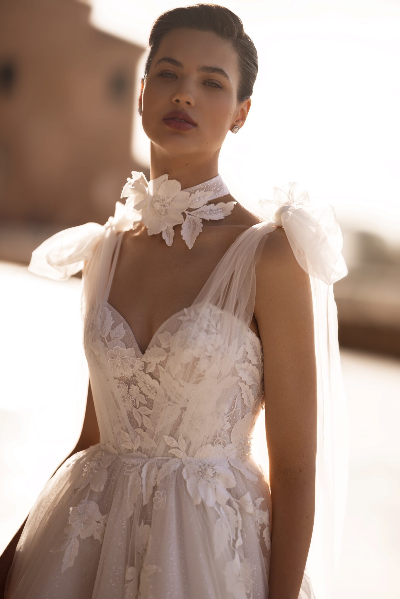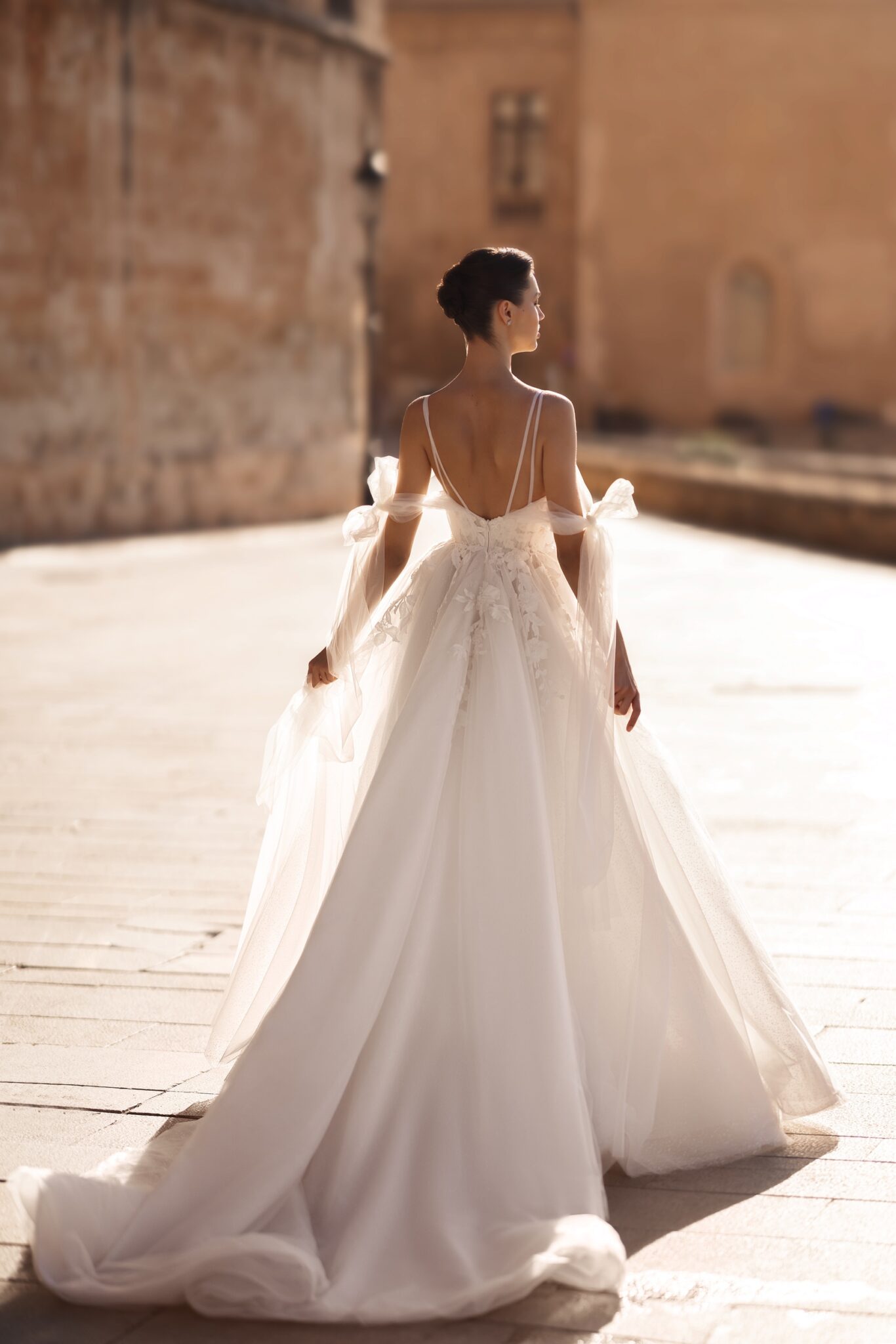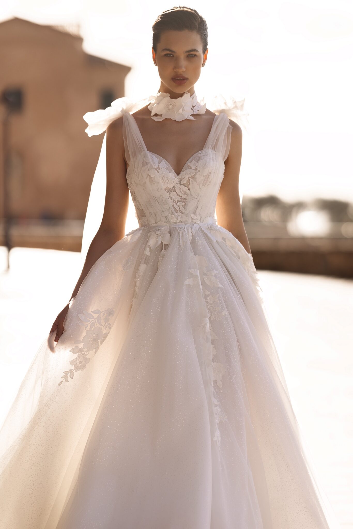 Alma de OroIntroducing our enchanting A-line wedding dress, a true embodiment of grace and beauty. Crafted from delicate tulle fabric, it envelops you in a cloud of ethereal charm. The corset is a work of art, adorned with intricate floral lace that cascades down the bodice, creating a captivating display of romance. The sweetheart neckline accentuates your natural beauty, while delicate tulle bows act as straps, adding a touch of whimsy and femininity. As you walk down the aisle, the long train gracefully trails behind you, leaving a trail of elegance in your wake. Every step is a dance, as the tulle fabric sways with your movement, creating an aura of effortless grace. This A-line wedding dress is a perfect fusion of timeless elegance and modern sophistication, designed to make you feel like a true princess on your special day. With its exquisite details, including the floral lace corset, sweetheart neckline, tulle bows, and captivating train, it is a symbol of everlasting love and a reflection of your unique style.