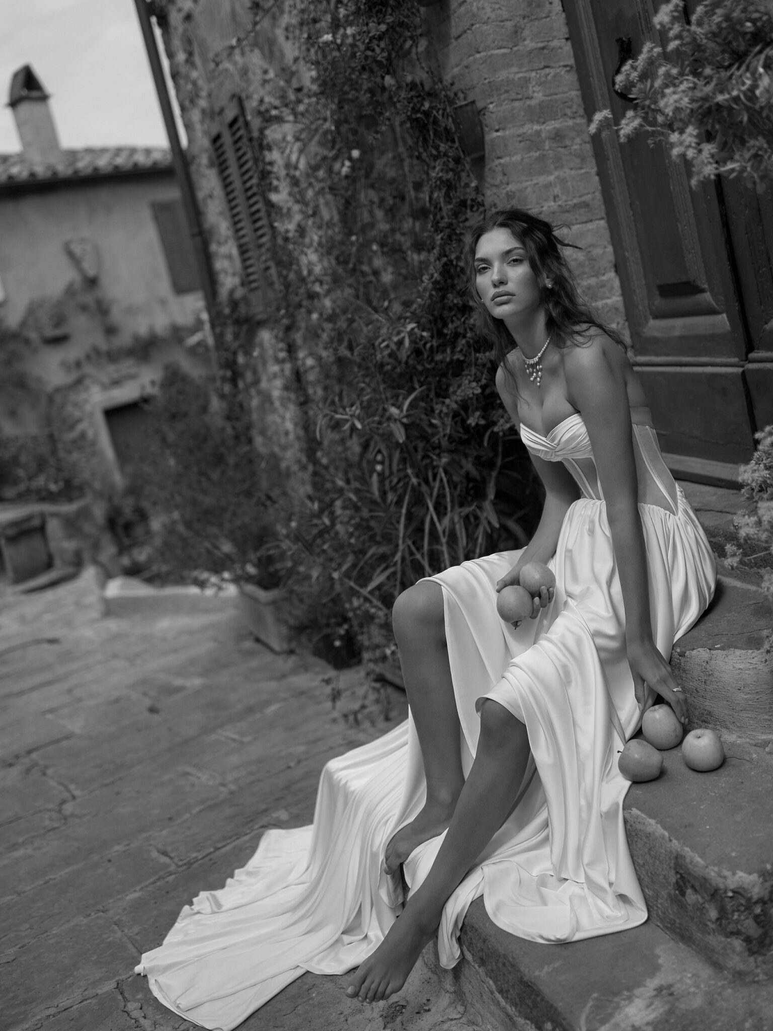 The skirt is made from flowing Armani silk, giving it an ethereal movement and a soft, silky sheen. A gentle train completes the look with effortless romance.
