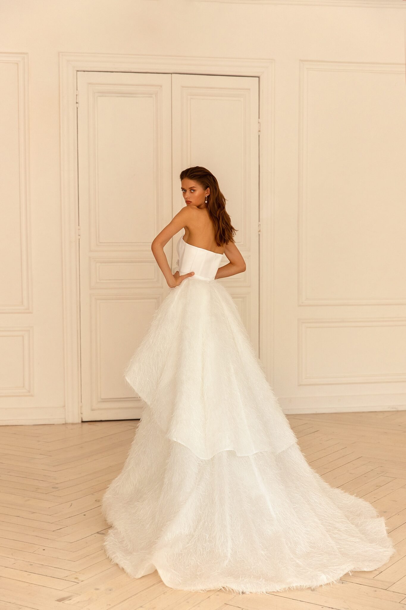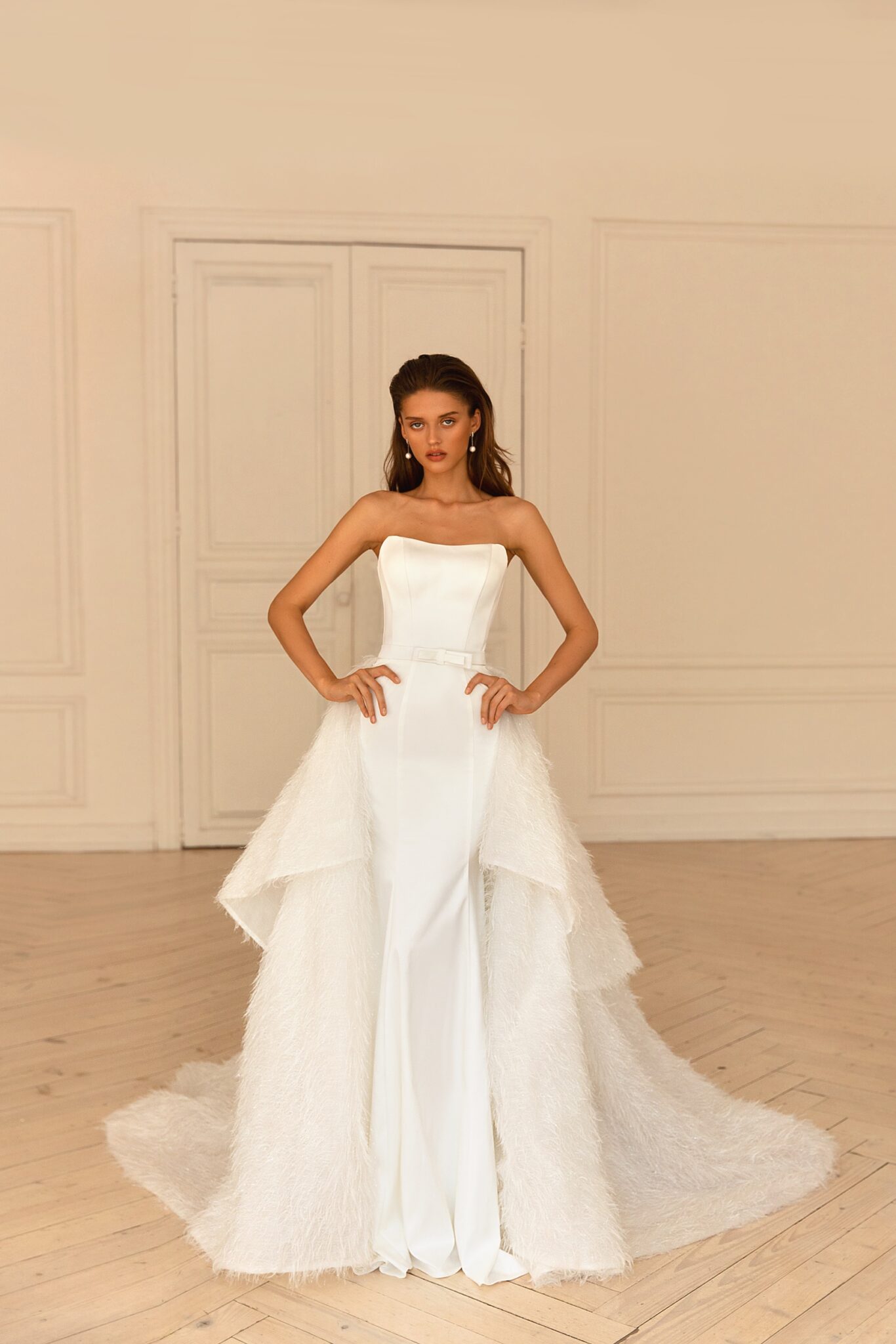 RomanceStep into the spotlight with Escada. Its nan silhouette, draped in the luxury of feathers, satin, is all about opulence and grandeur. It’s a gown that promises to make the bride the star of her big day, capturing the essence of pure elegance.