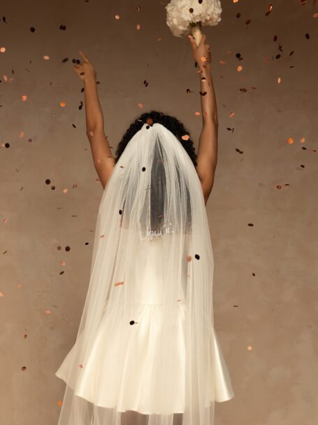 VeilsLaconic single-tier bridal veil made of transparent tulle and decorated with delicate floral patterned lace with 3D appliques on the edge. Available in cathedral length.