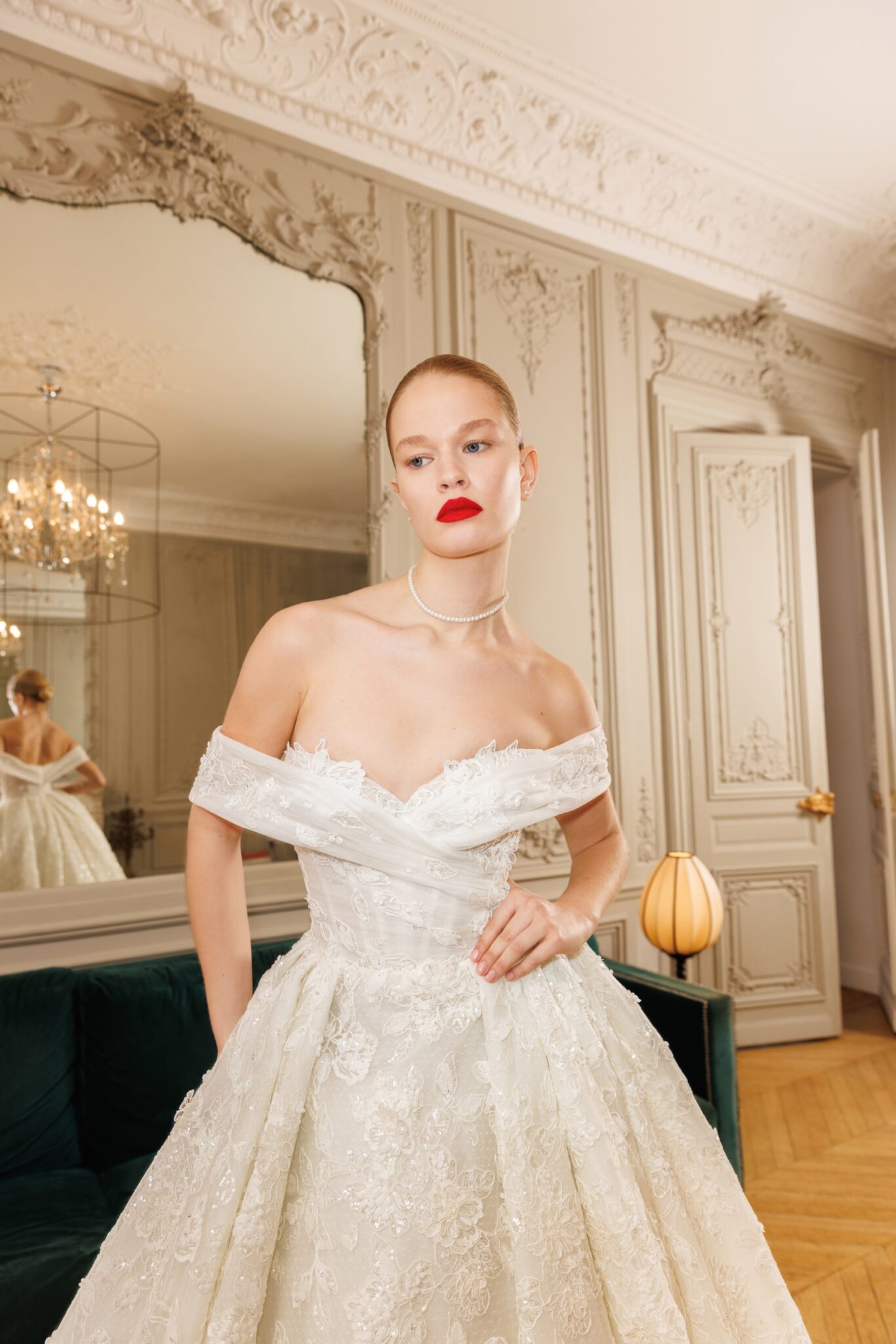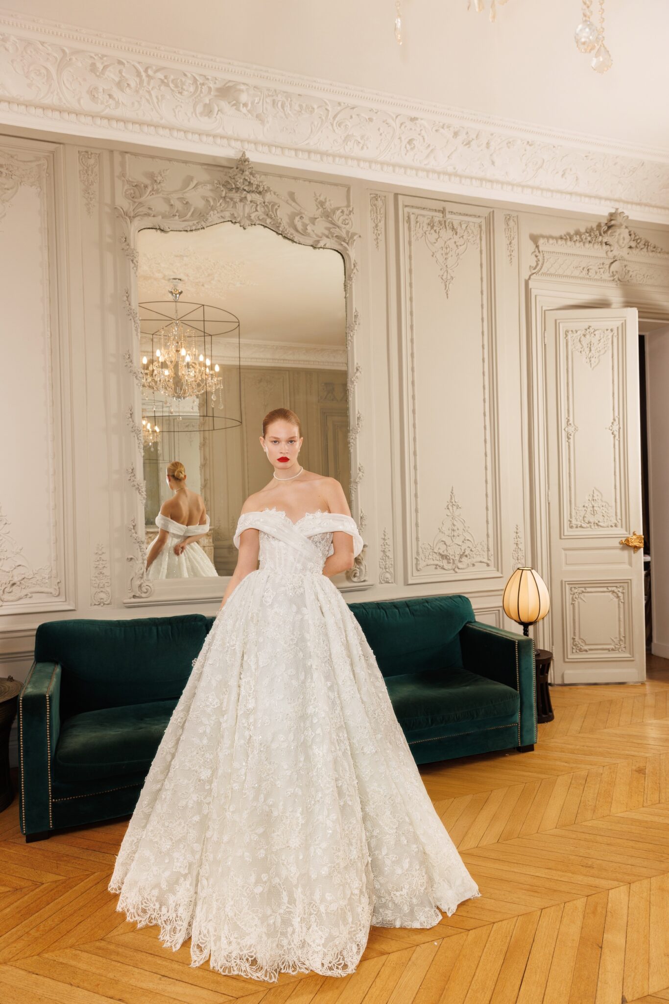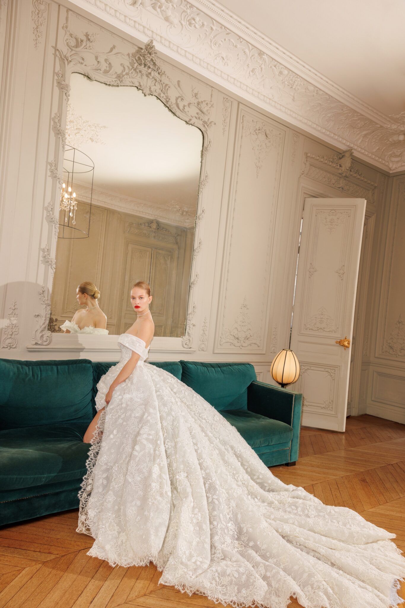 Atelier Lumiére, Plus SizeClassic mermaid tail featuring simple yet striking soft round neckline over a firm satin corset, being decorated with floral handcrafted ornaments and showcasing a laceup back. The skirt gathered at the front and back and creating soft drapery over the hips, while descending fluidly to the bottom is a symbol of elegance and an impeccable style.