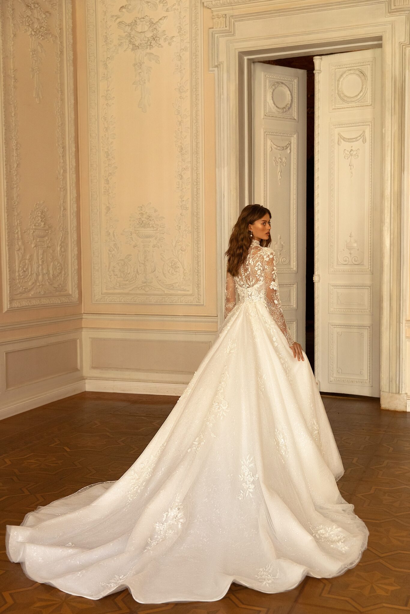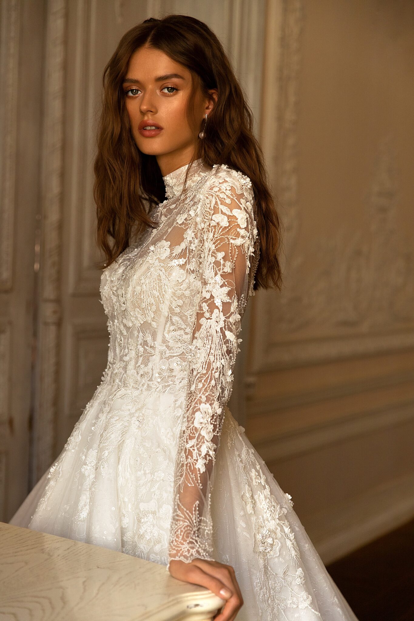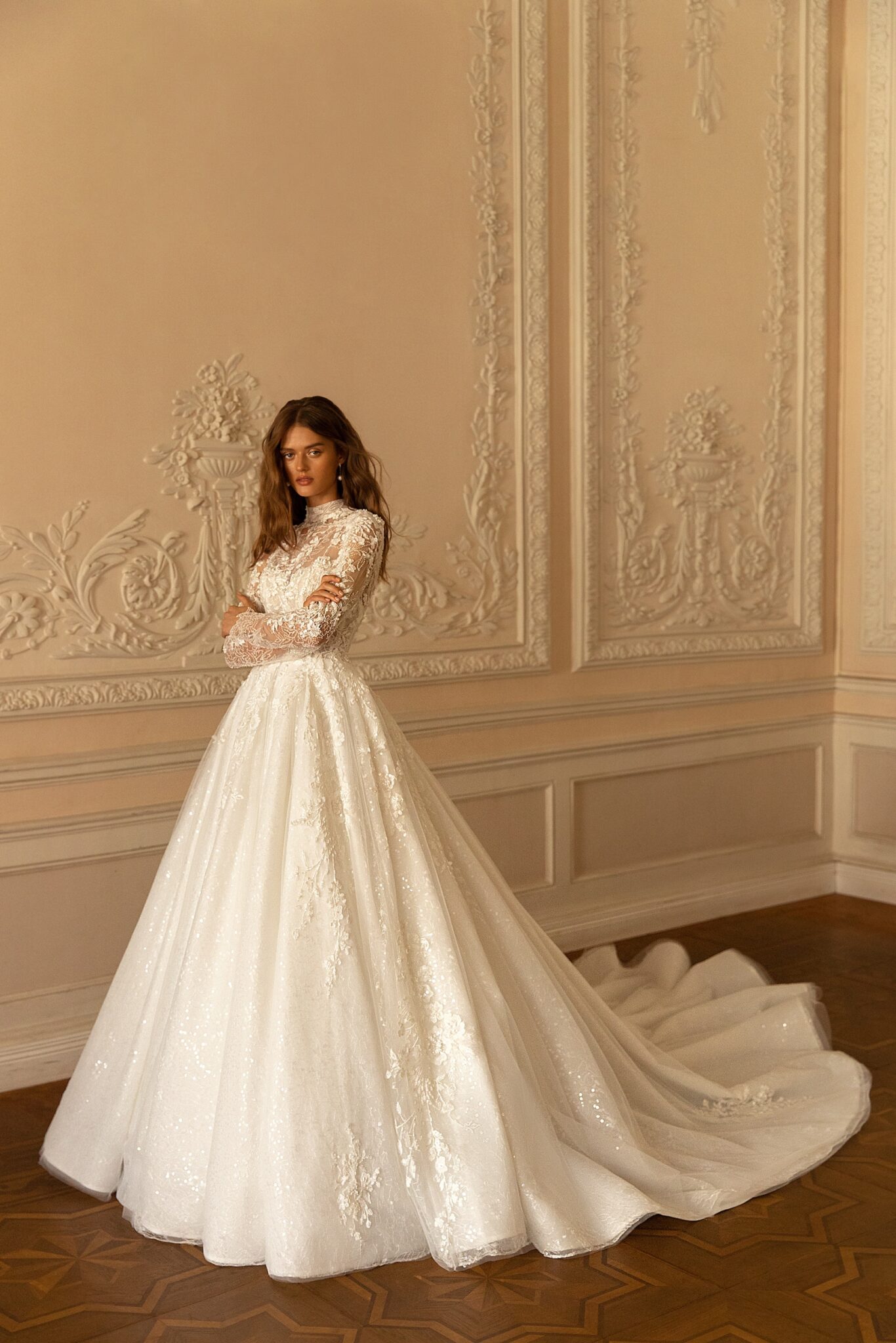 Romance, Plus SizeFelicity is a lace wedding dress with long sleeves and an extravagant low neck. This ball gown combines different lace patterns which make it eye-catching. An exuberant corsage is vastly decorated with lace patterns. A combination of lace and veiling looks splendid.