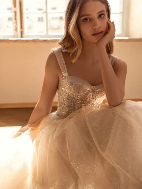 Less is more 2022Flora A-line gown reminds a wedding dress for a real princess. The corset is decorated with 3D floral lace with deep V-neckline. Those flowers can be found at the waistline and on the skirt. Tender translucent volumetric sleeves are embellished with veiling bows and small pearls. The loose A-line skirt looks fantastic with numerous layers of Tulle. The veiling skirt is also decorated with pearls through whole length and has no train.