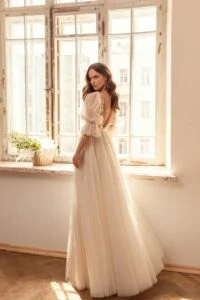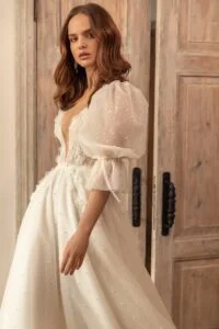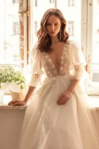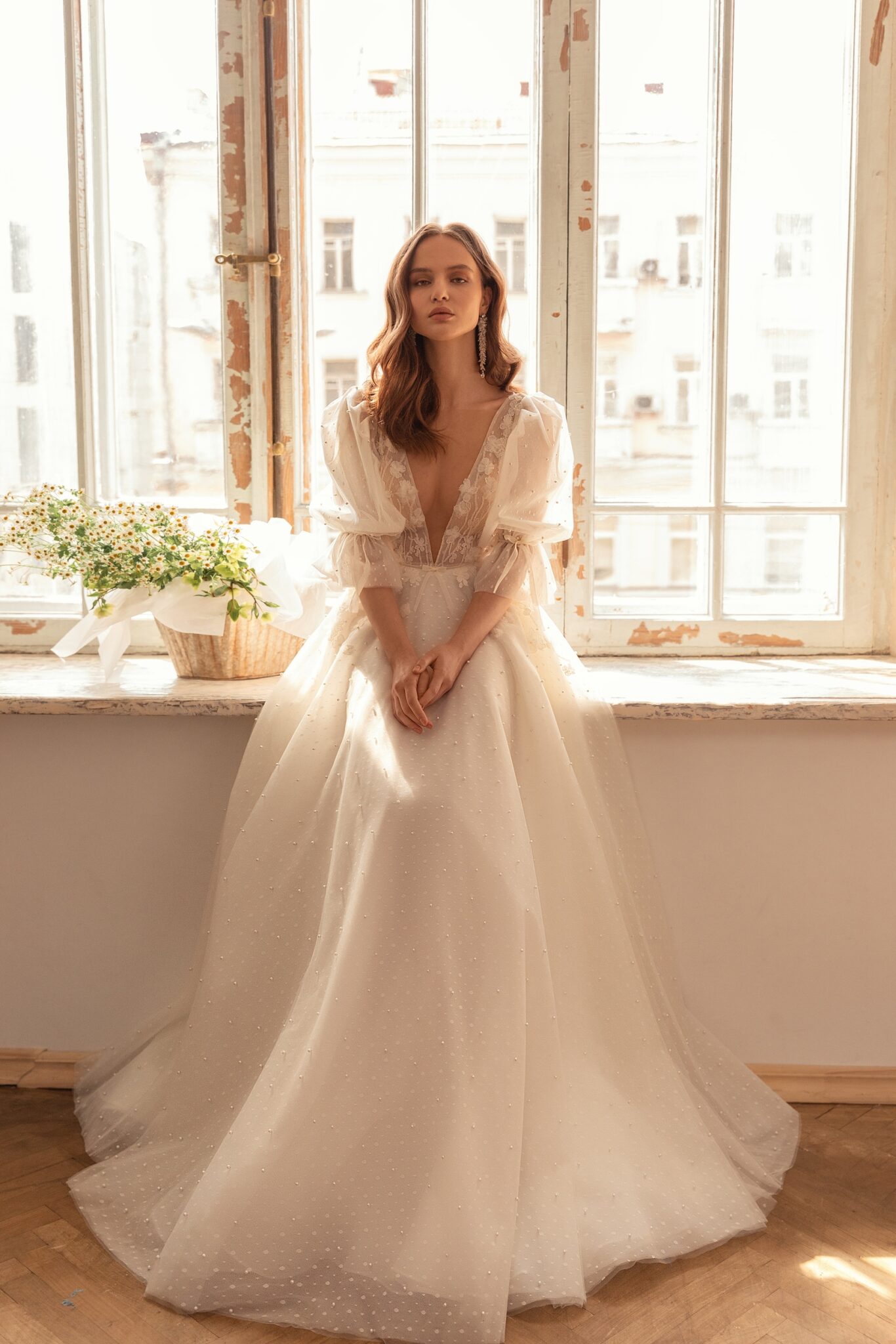 Less is more 2022Flora A-line gown reminds a wedding dress for a real princess. The corset is decorated with 3D floral lace with deep V-neckline. Those flowers can be found at the waistline and on the skirt. Tender translucent volumetric sleeves are embellished with veiling bows and small pearls. The loose A-line skirt looks fantastic with numerous layers of Tulle. The veiling skirt is also decorated with pearls through whole length and has no train.