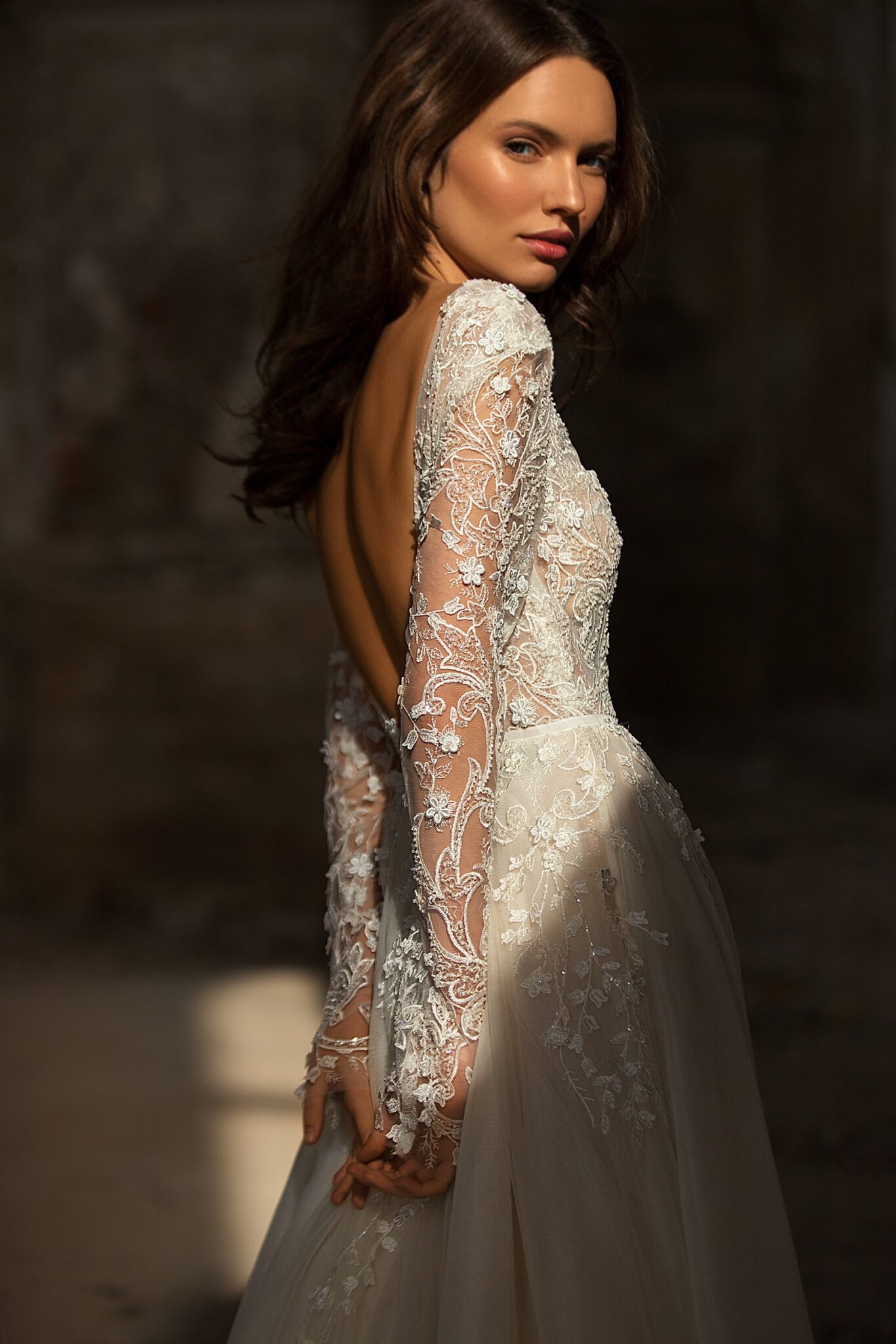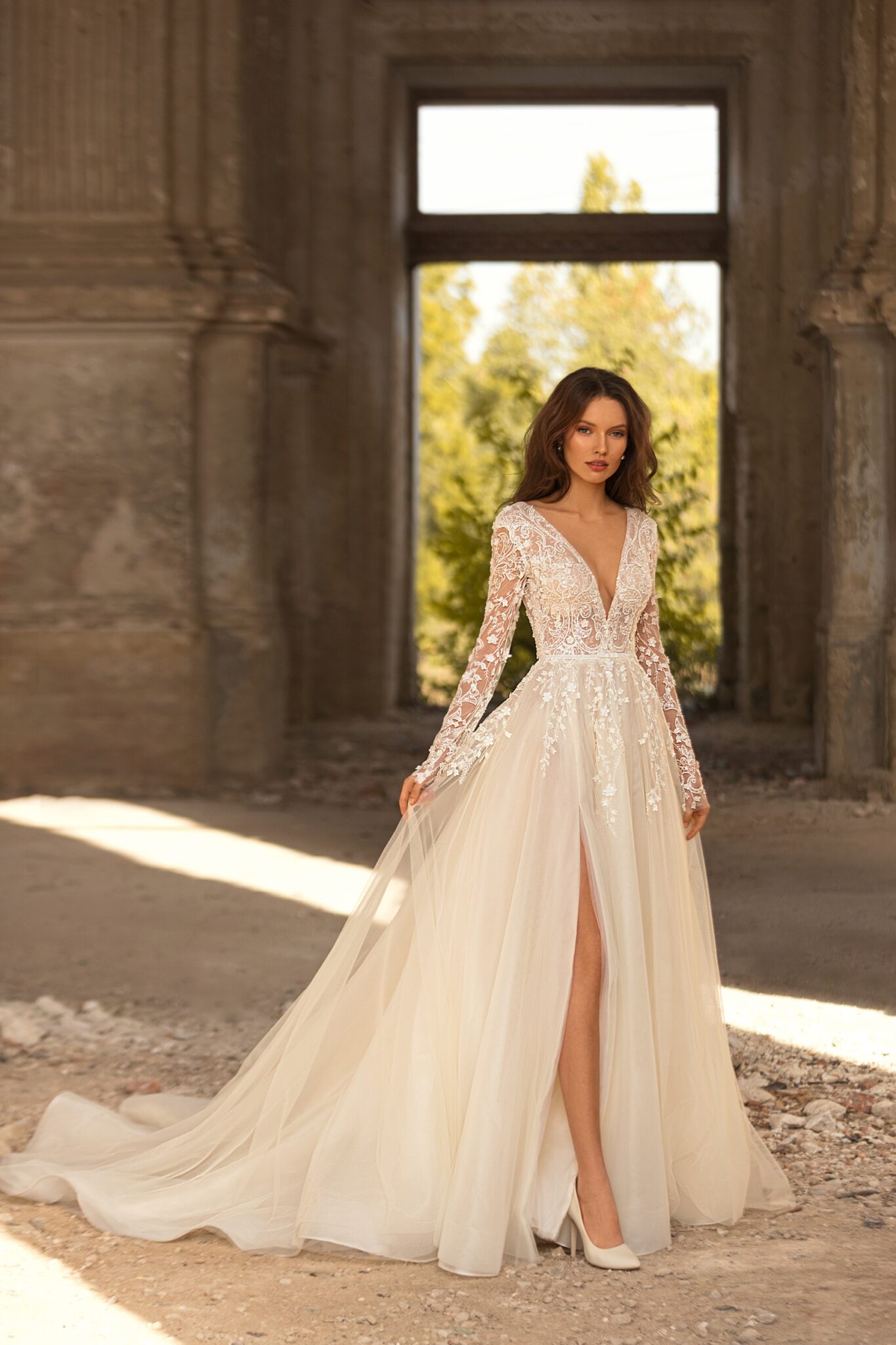 Golden Hour, Plus SizeFlorence gown is made of tule skirt that is simply decorate on the top with a lace that is going the gorgeous corset that is fully decorated. A combination of V-shaped neckline and long sleeves is a perfect match.