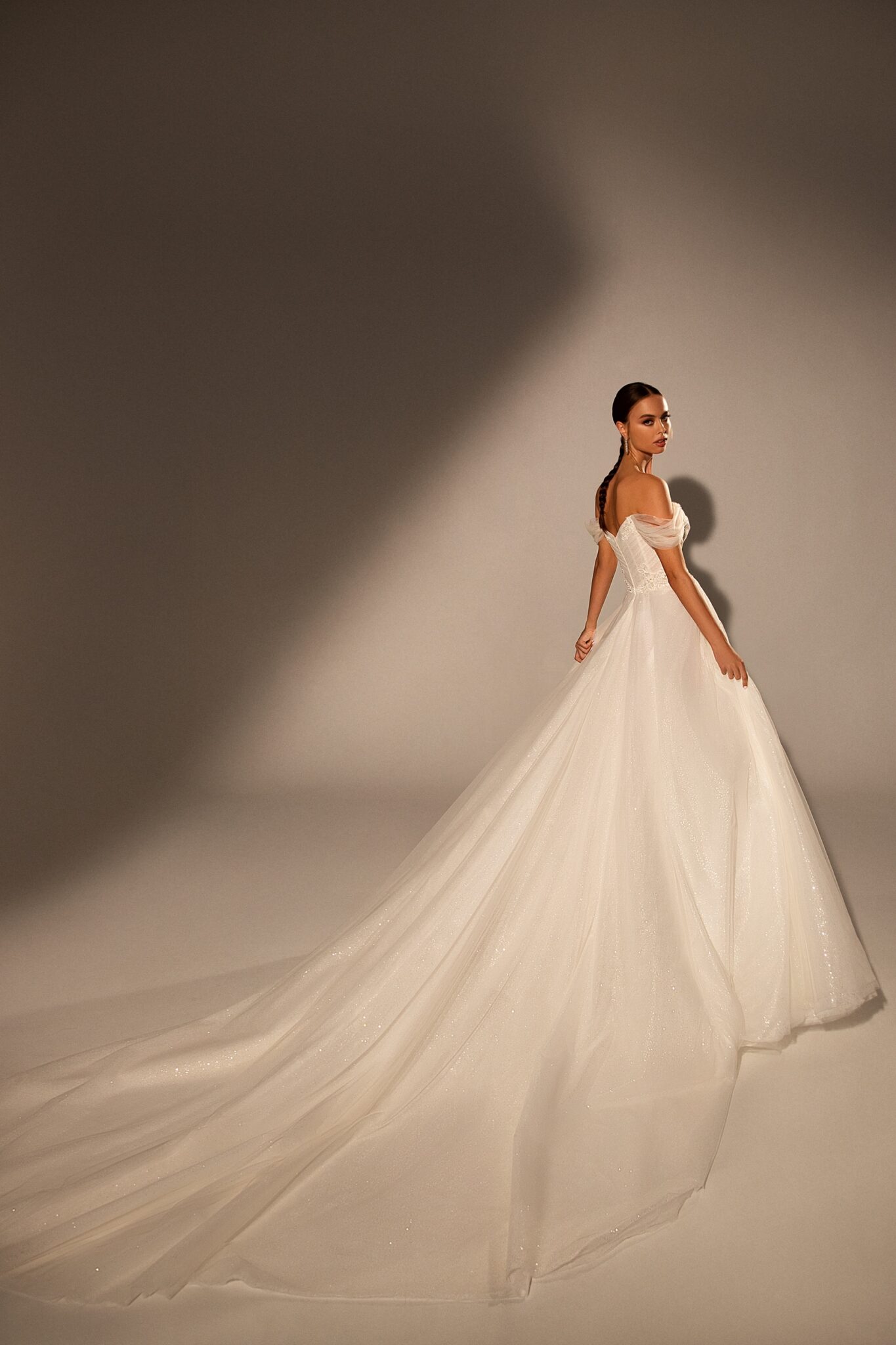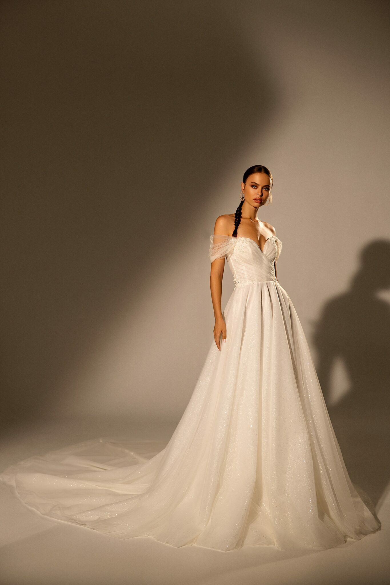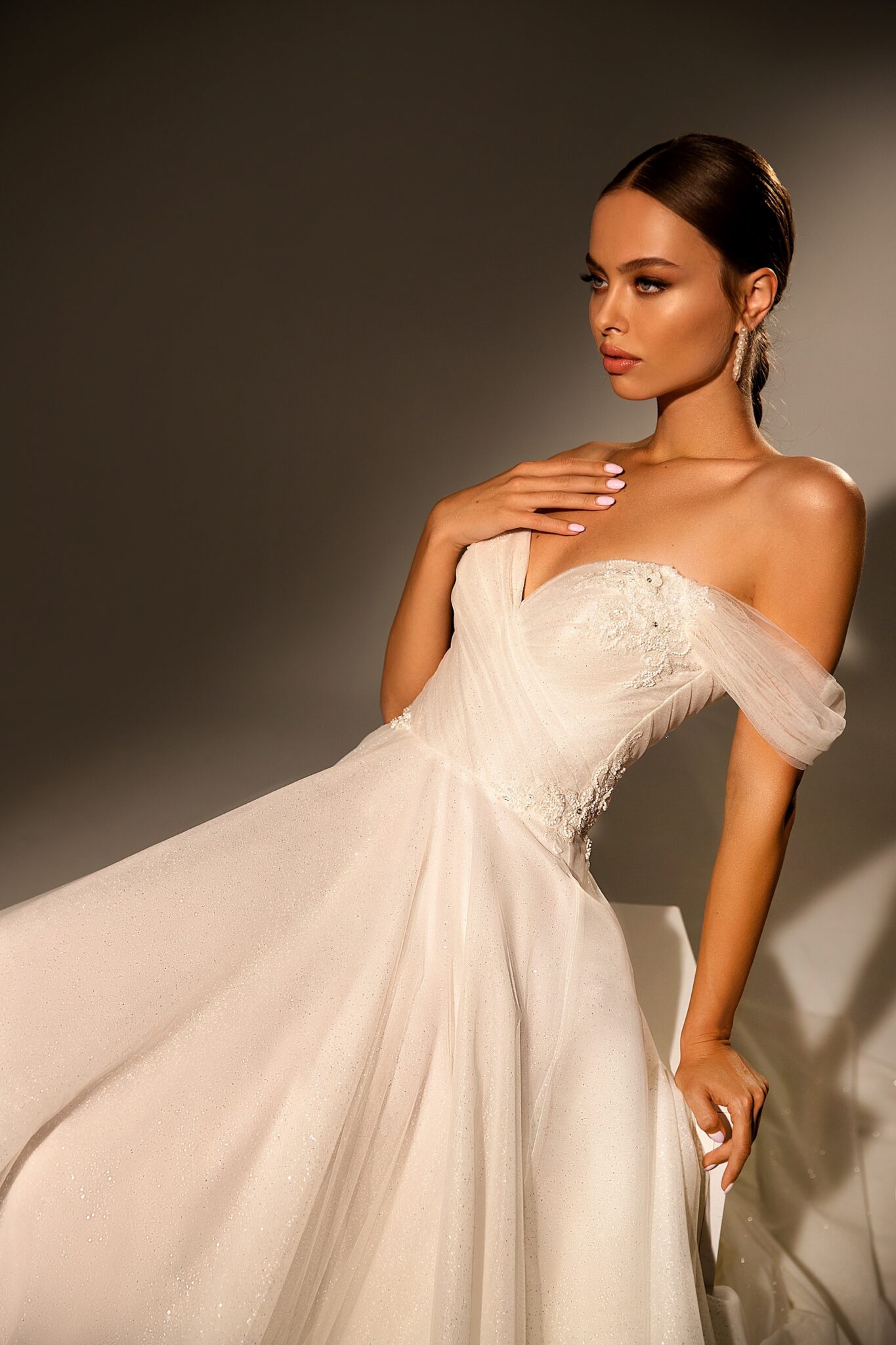 MuseA tender and laconic wedding gown with spectacular lace and embroidery. A bodice with lowered shoulders has a V-shaped neckline. It is decorated with a floral pattern and embroidered with beads and spangles. Lace inserts are also found on a veiling skirt. This fabulous skirt passes into a long train.