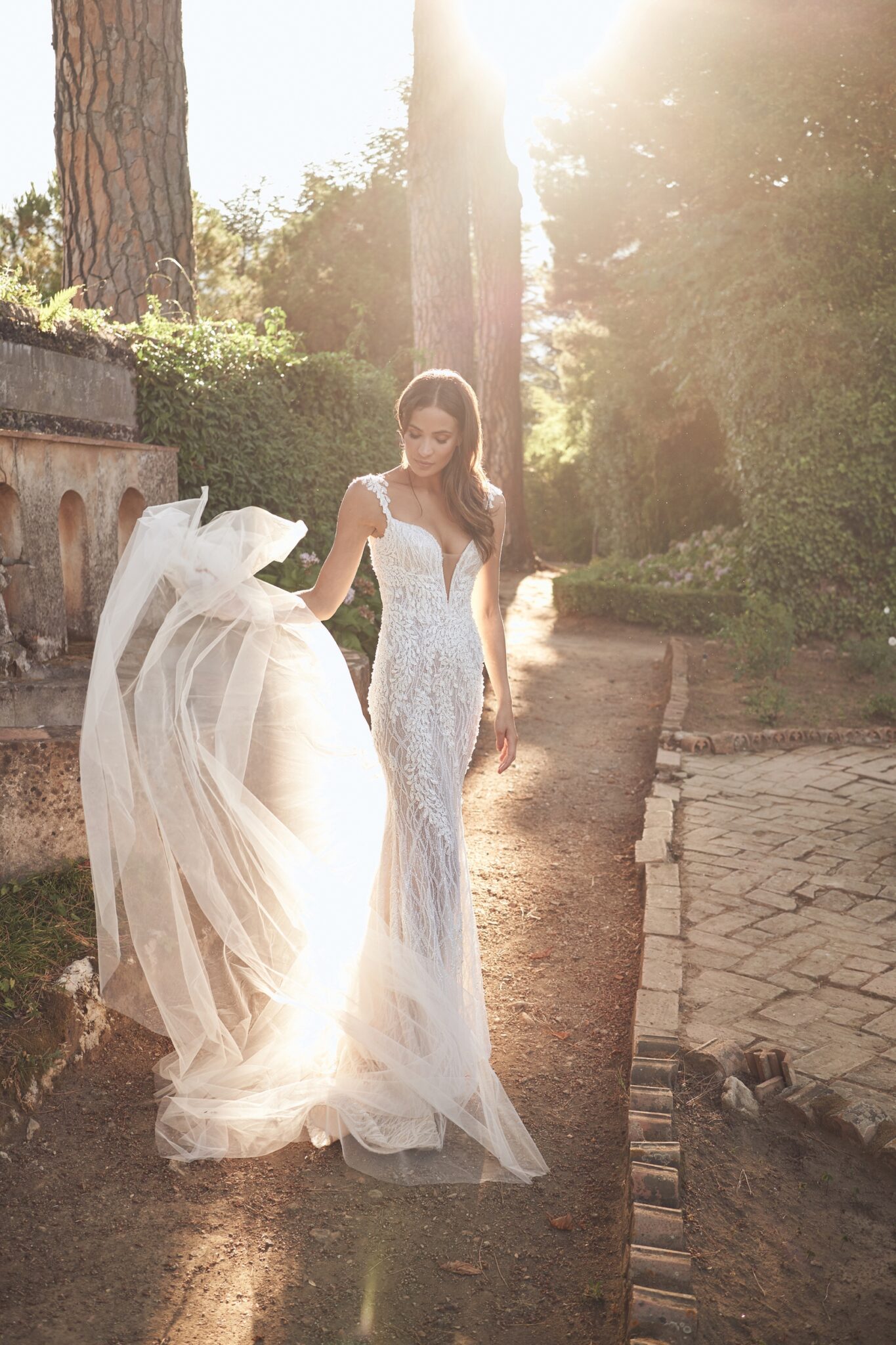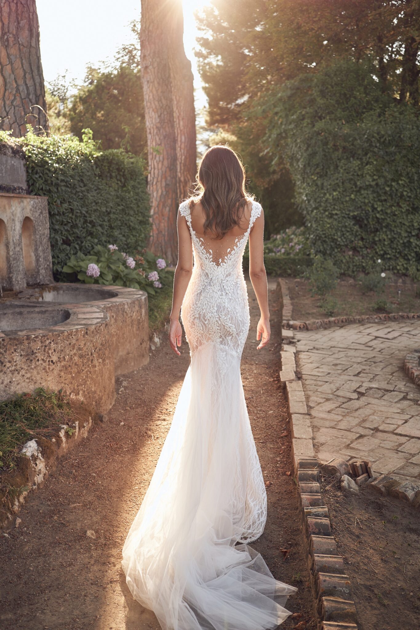 Love stories, Plus SizeGabi sheath dress is decorated with shining beads, crystals and spangles. Lace bra straps with floral motives highlight V-shaped low neck and deep neckline at the back of the dress. Those floral motives are found through the whole length of a wedding dress. A tail is removable and made of veiling.