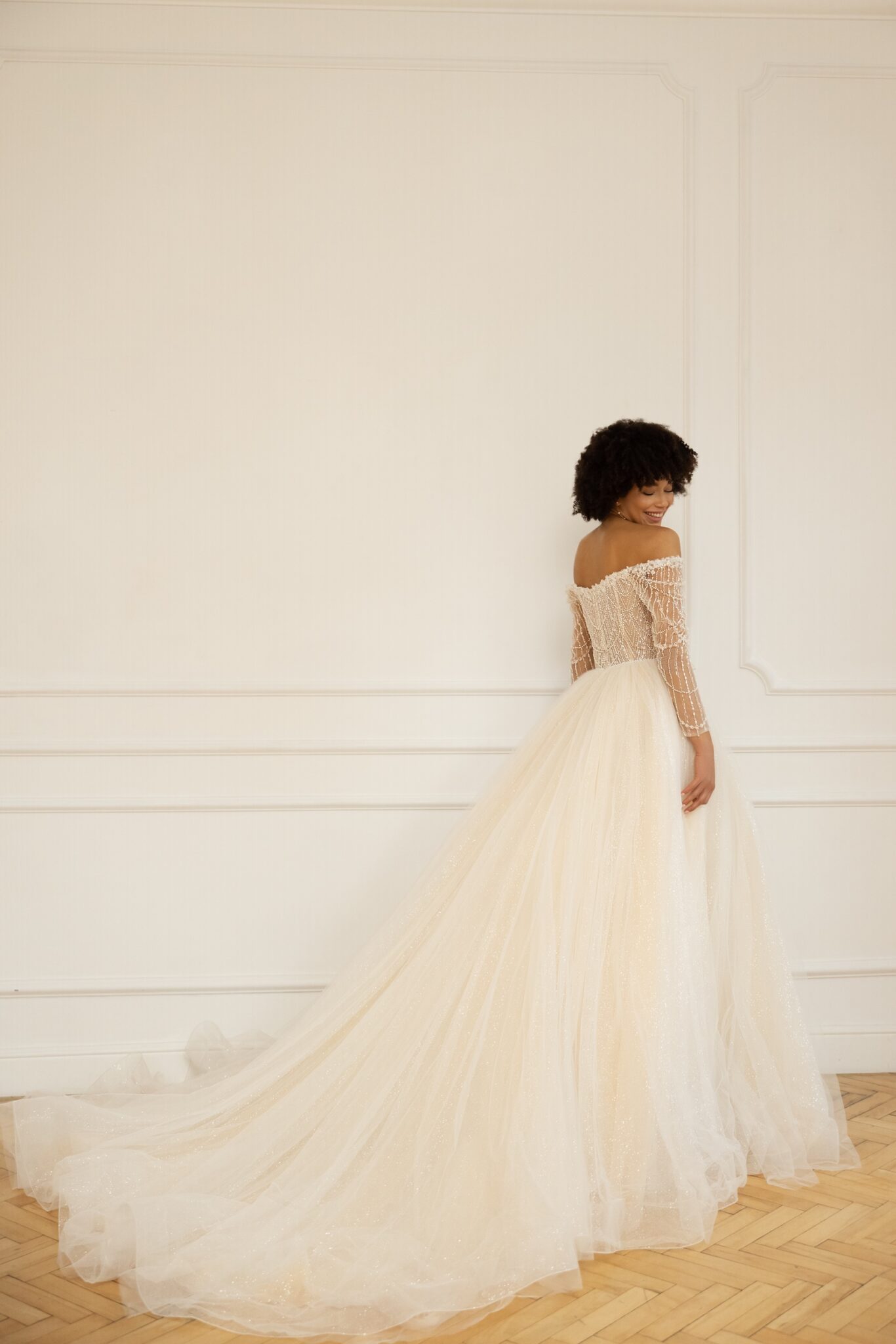 Less is more 2023This fantasy gown for modern romantic princesses has a cloud of gossamer Tulle shaping the skirt featuring a chic thigh-high slit and cathedral-length train. Corset-style bodice embellished with fine beadwork and impressive long illusion sleeves bare the collarbones for a more feminine look